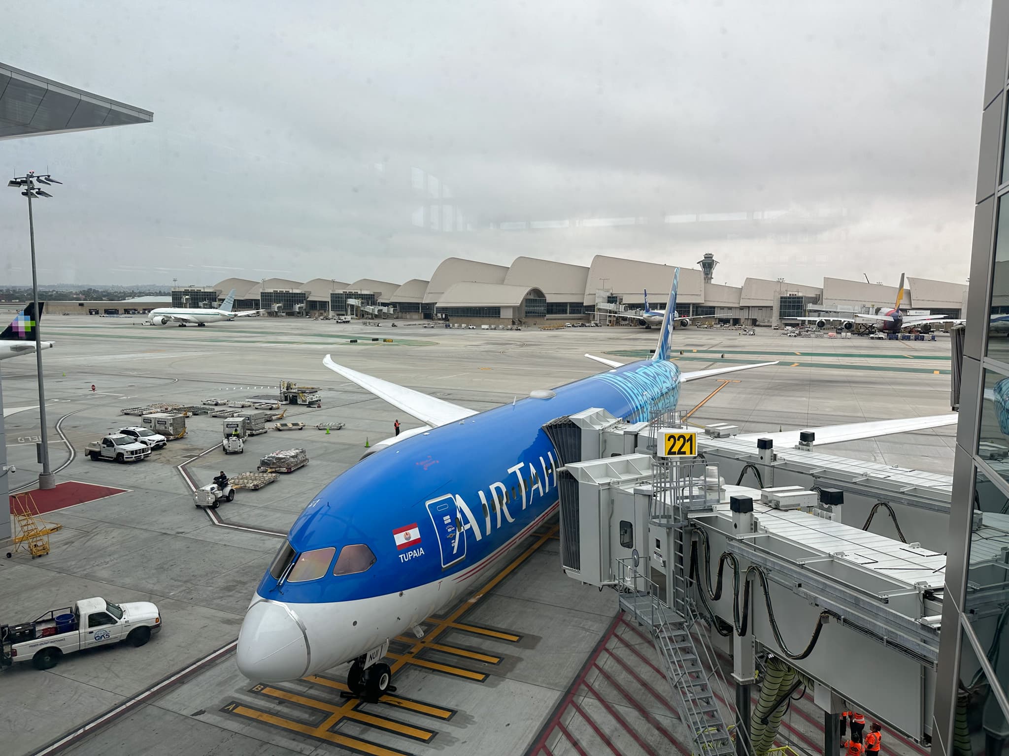 今回はタヒチのフラッグキャリア『エア タヒチ ヌイ』を利用しました。現在、日本からの直行便は運休中。アメリカからは直行便の運行が再開しているので、ロサンゼルスやシアトルを経由して訪れることができます。カリフォルニア在住の私は、ロサンゼルスからの直行便に搭乗。ロスからは7時間半のフライトでした。