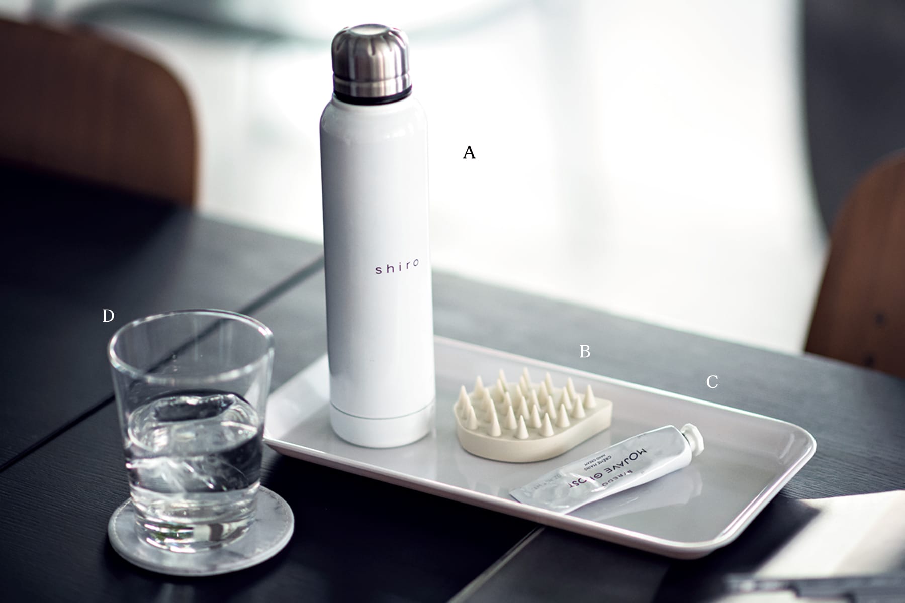 A.SHIROの水筒。今の時期は暖かい飲み物を持ち歩くようにしています。シンプルなデザインがお気に入り。B.ETVOSのブラシは目を使いすぎた時にマッサージすると集中力が高まります!C.BYREDOのハンドクリームはシリーズ買いするくらいお気に入りの香り。D.大理石のコースターはデスクの目印にも。