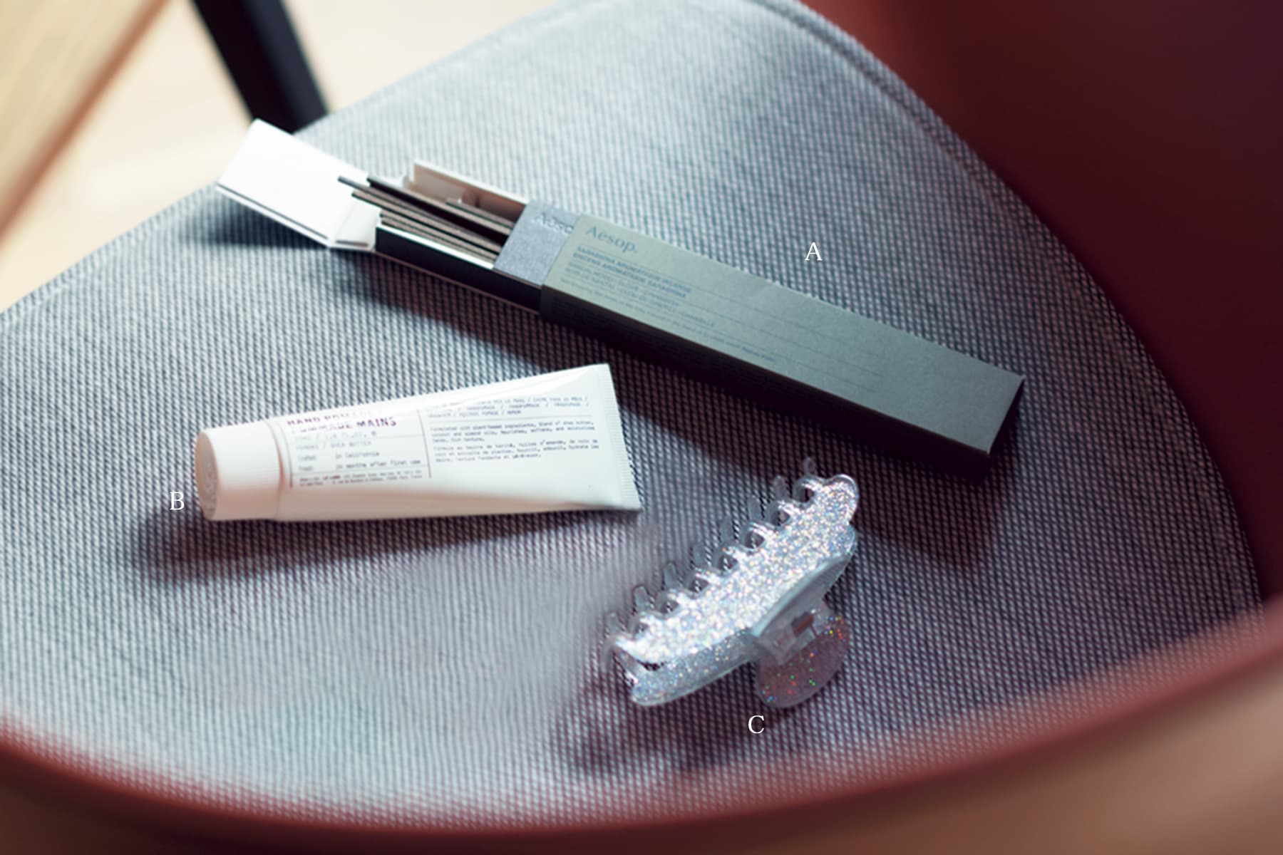 A.イソップのお香は仕事モードにスイッチを切り替えるタイミングでよく使います。B.LELABOのハンドクリーム。ヒノキの香りが元々好きなので、乾燥対策をしながら香りを楽しめるのが嬉しい。C.キラキラが可愛いH&Mのヘアクリップ。少しキャッチーなデザインぐらいの方が気分が上がるヘアクリップは、カバンにつけても◎。