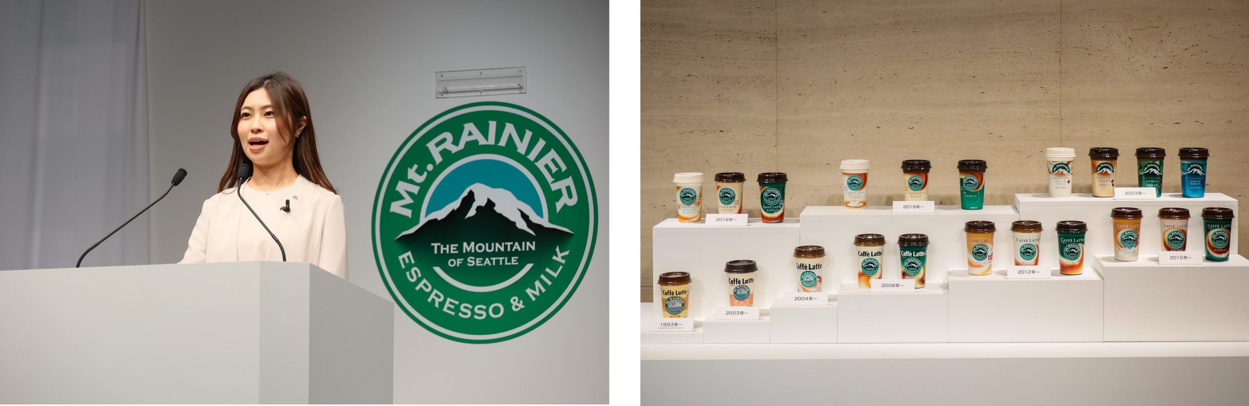 発表会冒頭、プレゼンテーションを行った佐熊氏は、30年という年月をかけて歩んできた「マウントレーニア」の歴史を振り返りながら「1993年2月に誕生したチルドカップコーヒーのパイオニアである「マウントレーニア」は累計売上本数90億本以上のチルドコーヒー市場売上No.1のブランド」と紹介するとともに、「現代の社会環境を鑑みた時に、改めてブランドとして、『山の様に、どんな人にとっても安心できる、やさしい存在』となる事を目指しロゴ・パッケージも含めたリニューアルを行い、その想いを『今日がやさしくなっていく』というコミュニケーションコンセプトにこめた』と30周年のリブランディングに込めた思いについて語りました。