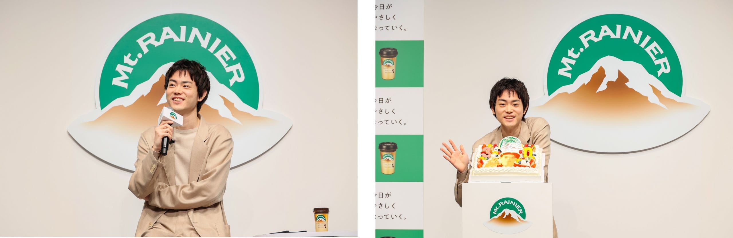 また、この日にマウントレーニアと同じく30歳の誕生日を迎えた菅田さんとマウントレーニア30周年を記念したバースデーケーキがプレゼントされ、菅田さんは「ダチ感ある(笑)。不思議な縁だな。」と喜びを表していました。