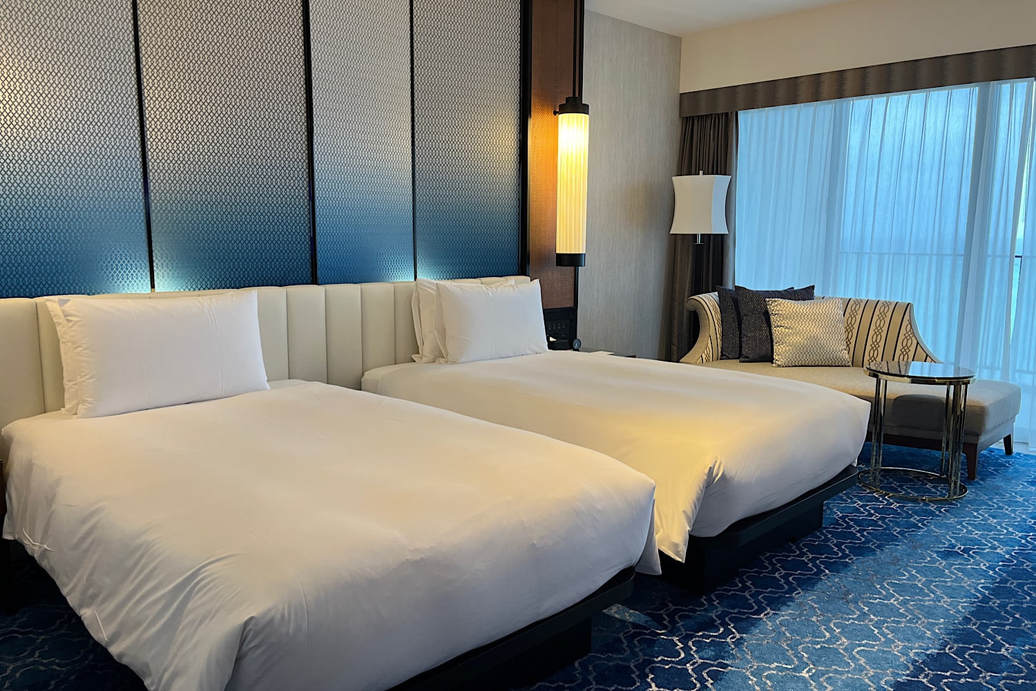 先ほどの「プレミアクラブツイン」と同じサウスウイングに位置するスイートルームエリア。4パターンから成るスイートルームのなかで、特に高い人気を誇っているのが「パノラマコーナースイート」。L字形バルコニーが設けられた贅沢な造りで、究極のリゾート体験を味わえます。価格帯の目安は、オフシーズンで10万円〜。クラブラウンジ利用権のほか、スイートルーム宿泊者特典としてVIPプールバー「Oasis」の利用権もついてきます。