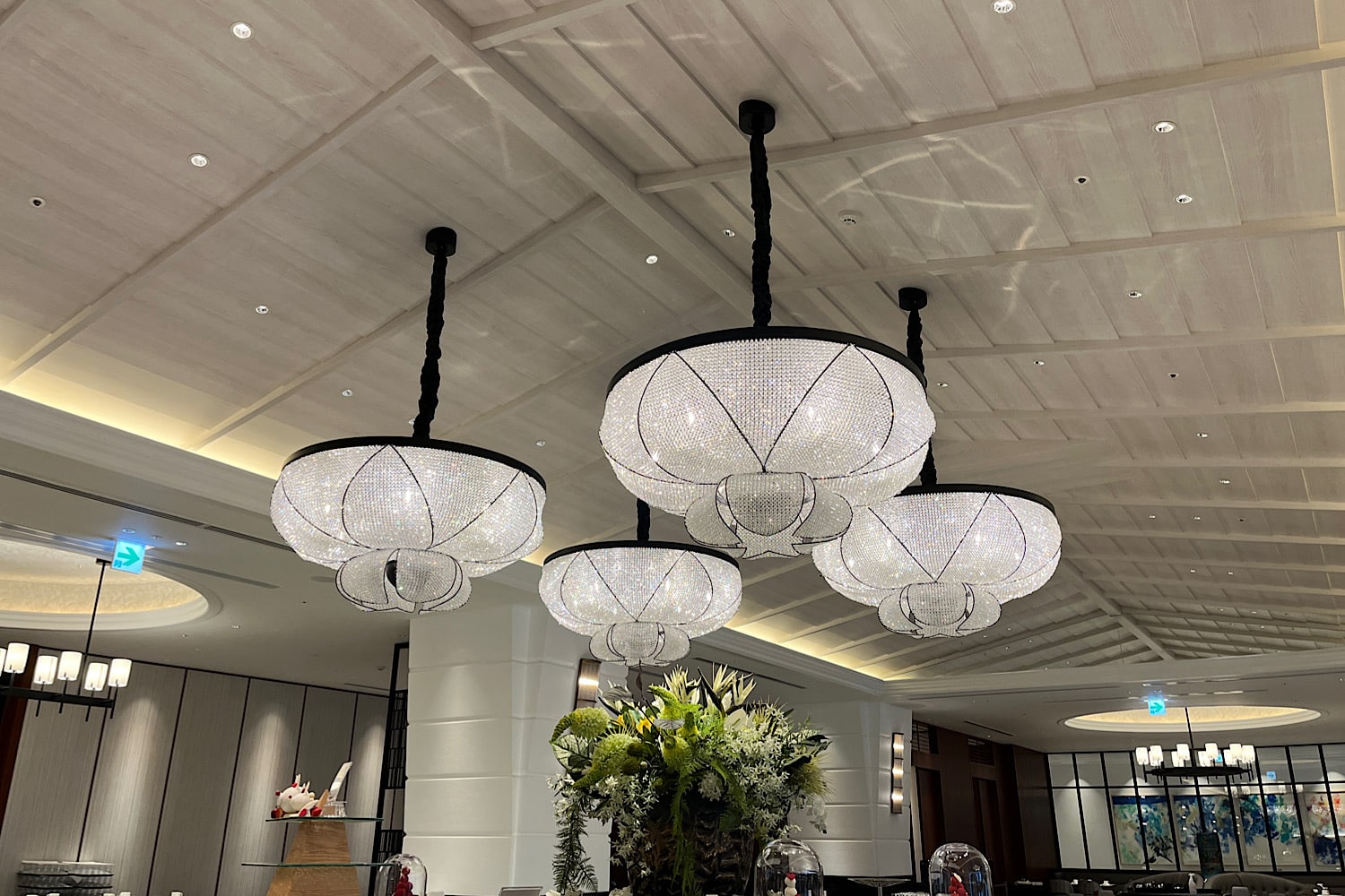 ホテルのデザインコンセプトは「琉球コロニアル」。南国に見られる欧風の建築様式と沖縄の伝統文化の美しさをかけ合わせたモダンな内装が特徴です。「琉球コロニアル」を感じられるデザインの一例として、ビュッフェダイニング「Nashiro」の天井に注目。琉球舞踊衣装の「花笠」をモチーフにしたシャンデリアと、沖縄の古民家で見られる「寄棟」を取り入れた天井がダイニングの象徴になっています。