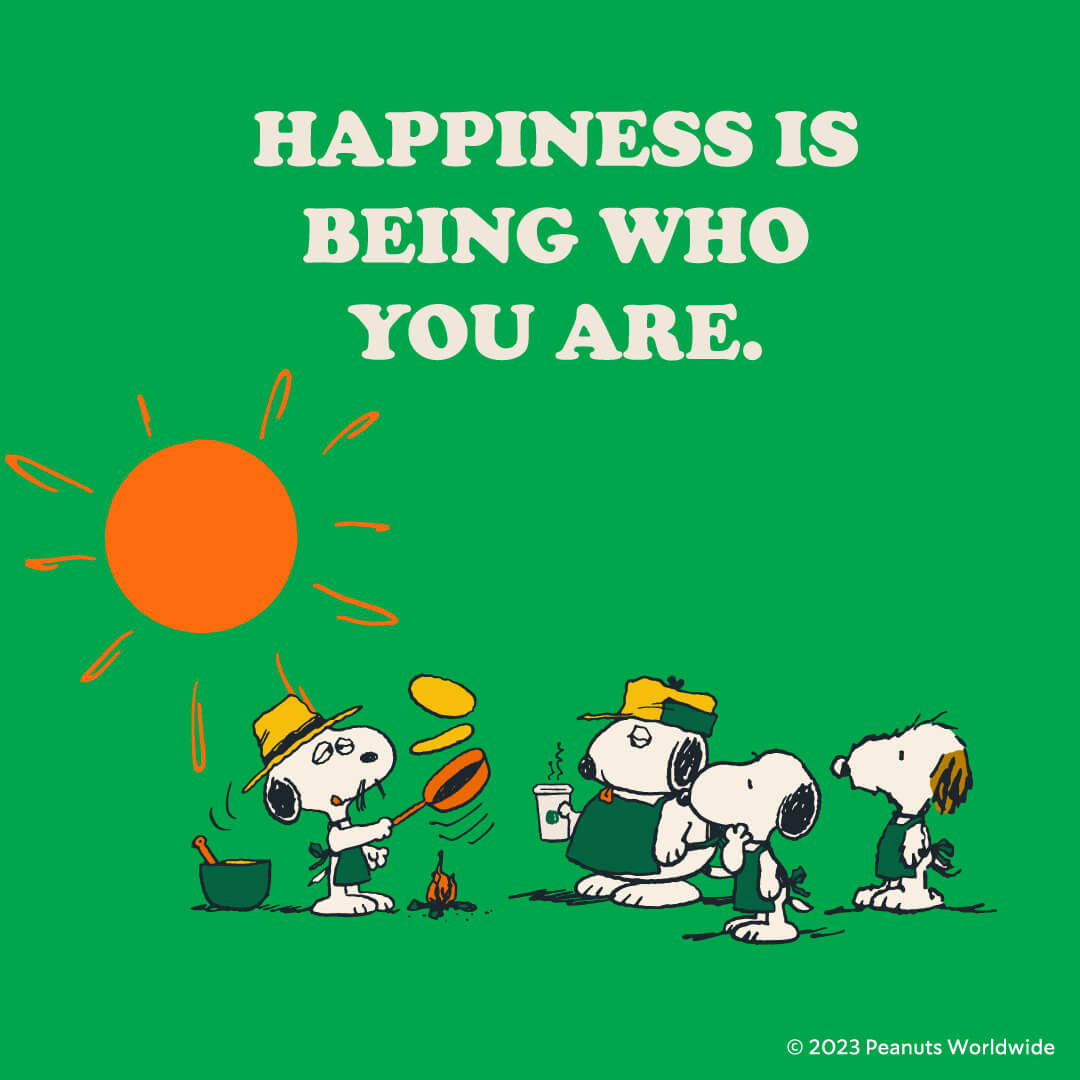 PEANUTSとコラボレーションしたスターバックス カードです。” HAPPINESS IS BEING WHO YOU ARE.”のメッセージと共に、Snoopyが、兄弟のOlaf、Andy、Spikeと一緒にコーヒーを楽しむ様子がアートワークとして描かれています。ご自身でご愛用いただくのはもちろん、PEANUTSが好きな方へのカジュアルギフトにいかがでしょうか。