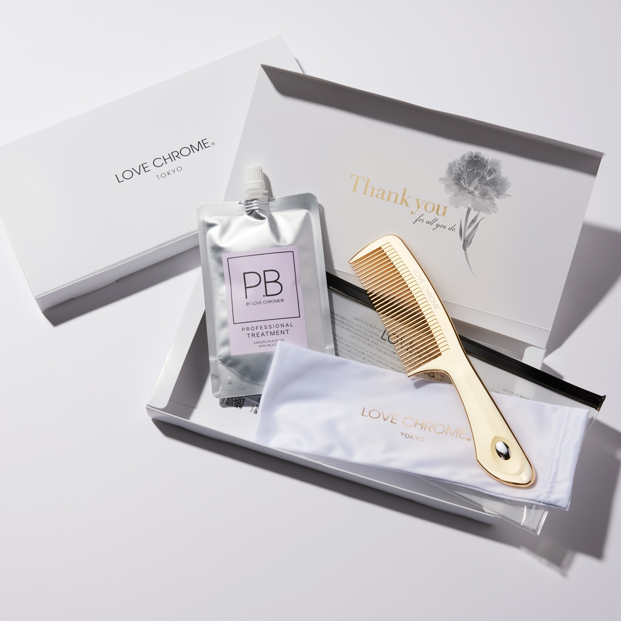 「今話題のヘアコーム『LOVE CHROME』は、日本の工業技術を活かした特殊加工が施されており、“髪をとかすだけでストレートアイロンをかけた後のようにサラツヤ髪になれる”と話題です。 母の日限定ギフトボックスにはヘアコームに加えて、ツヤ髪を叶えてくれるトリートメント、持ち運びに便利なケースが2種類付属。ボックスに使用方法が書いてあるので、初心者さんでも簡単に美髪が手に入ります」(中川さん)