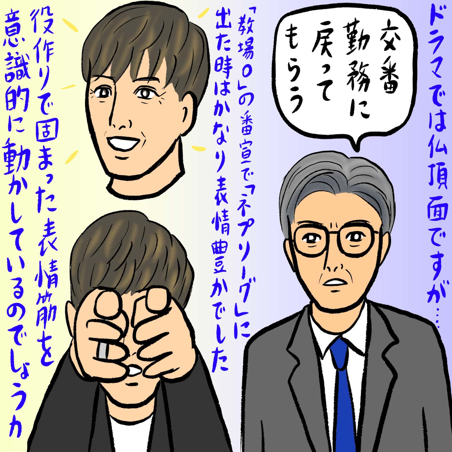 常に苦々しい口調&表情の風間ですが、お腹を抑える瓜原を「痛いのか。薬は飲んだのか」と気遣う一面も。しかし一瞬の優しさのあと「転属願いの紙は何枚もある。腹はくくっておけ」とすぐに厳しい口調になるのが、鬼教官キャラの照れ隠しのようです。同じく萌えシーンといえば、瓜原に腹痛の症状が出て医師の母親(斉藤由貴)に診察され、お腹を露出して押されるシーン。赤楚衛二のお腹が突然アップになり、ソフトな診察シーンに癒されました。瓜原が美幸に聞き込みしている時に、風間は横で「こういう時は疑っていると言って圧をかけて反応を見ろ」と、聞こえるようにアドバイス。「刑事になったばかりで指導受けてます」と、瓜原が正直に言うと「えっ。大変ですね」と、笑う美幸。もしかしてこれは気を緩ませて口を割らせる作戦なのでしょうか……。