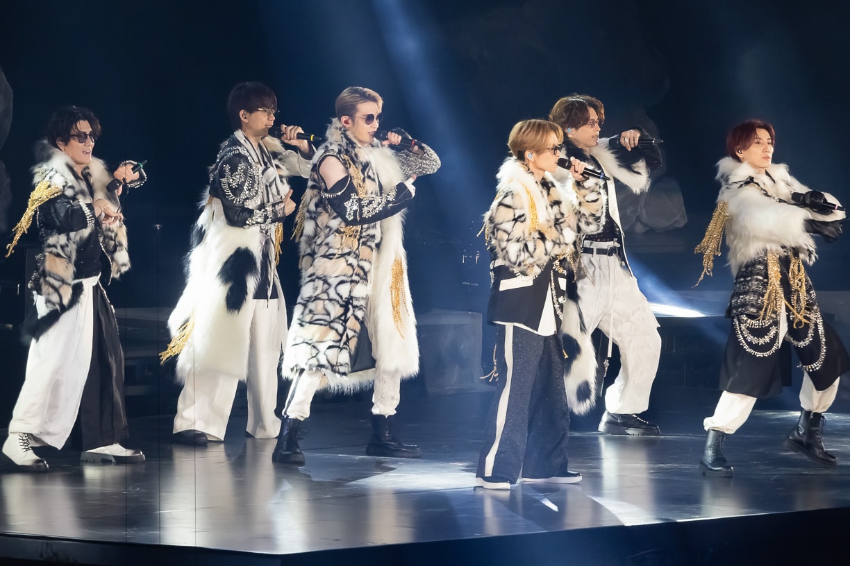 ドーム公演からお披露目された新衣装は、ファーとゴールドチェーンをあしらった白基調のゴージャスなスタイル。アカペラで6人のハーモニーを聴かせる『Overture -VOICE-』のオープニングに続き、炎の特効が鳴り響いた後にパフォーマンスされたのはJr.時代からの人気曲『Amazing!!!!!!』。音源化されていないため、ライブでしか聴けない貴重なパフォーマンスに、楽曲が始まった瞬間から会場は最高潮な盛り上がり。やはりJr.時代の人気曲『IN THE STORM』や『Boom-Pow-Wow!』など最初からハードなチューンでたたみかけます。曲ごとにメインステージからセンターステージ、バックステージへと歌唱しながらゆっくり堂々と歩く6人の姿は、初単独ドームとは思えない貫禄さえ感じさせました。