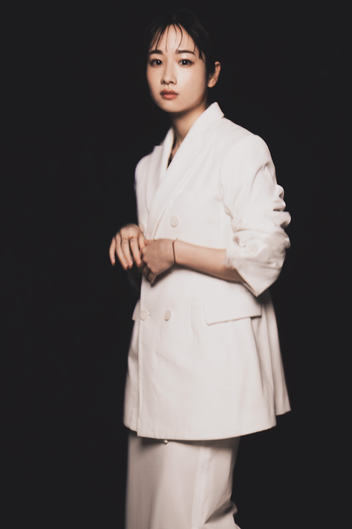 ジャケット¥103,400チュールレイヤードパンツ¥53,900中に着たつけ襟¥56,100(すべてチカキサダ/エドストローム オフィス)シューズ¥50,600(カチム)ブレスレット¥253,000右手人差し指リング¥209,000(ともにシハラ/シハラ トウキョウ)右手中指リング¥15,400(エネイ/エネイ松屋銀座)