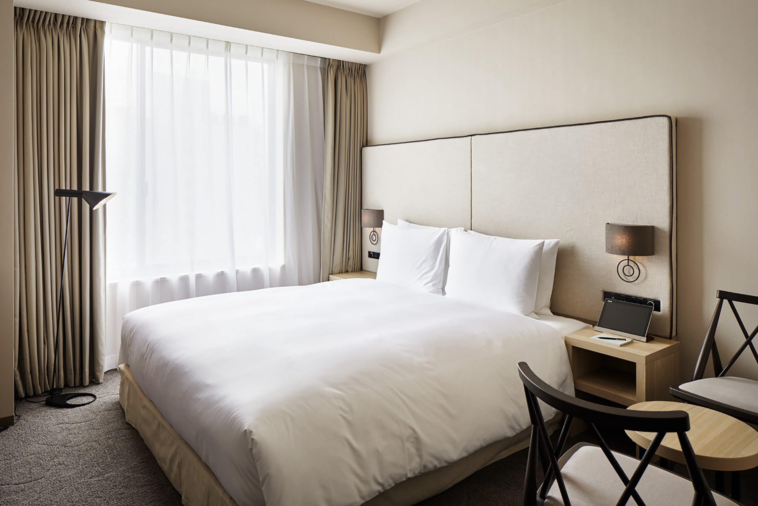 客室は、シンプルでモダンなインテリアで揃えられた、無駄の無い洗練されたデザイン。落ち着いたトーンの配色が心を和ませてくれます。チェアやソファ、テーブルなどは、地域に根付いた独自の伝統や技術を継承し製作された高品質のオリジナル家具が配置されています。