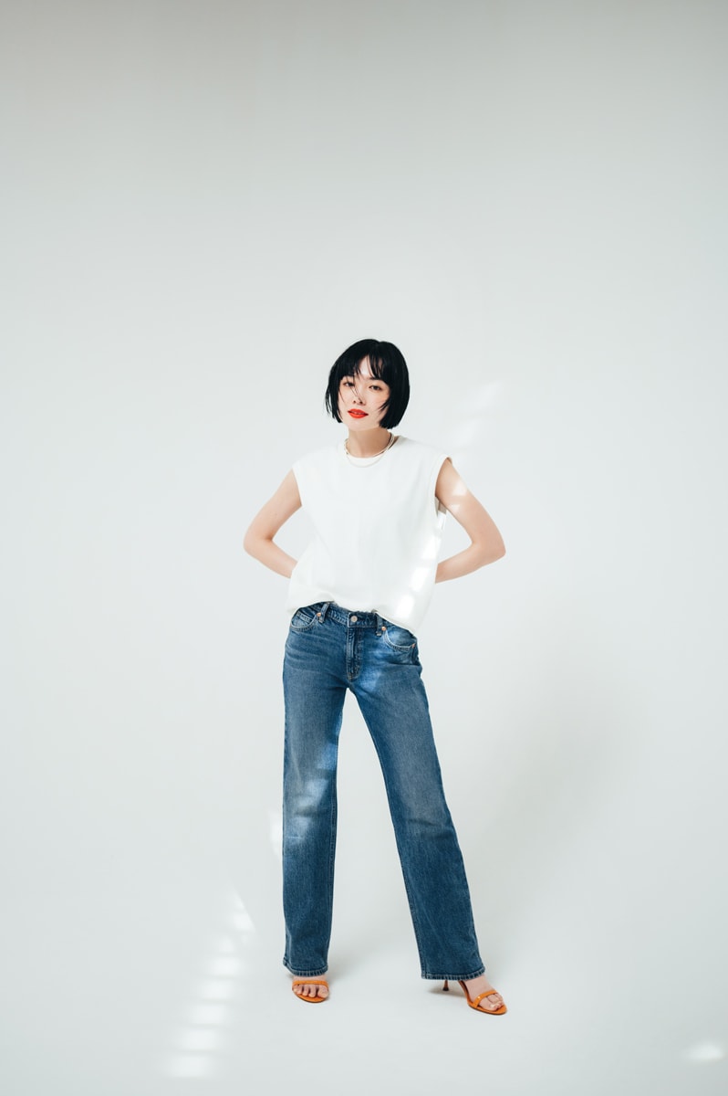 ノースリーブカットソー¥6,000(バナナ・リパブリック)デニムパンツ¥7,990(Gap/Gap新宿フラッグス店)サンダル¥6,990(マンゴ/ロコンド)ネックレス¥46,200(アルポ/ZUTTOHOLIC)バングル¥12,870(チビ・ジュエルズ/チビジュエルズ・ジャパン)