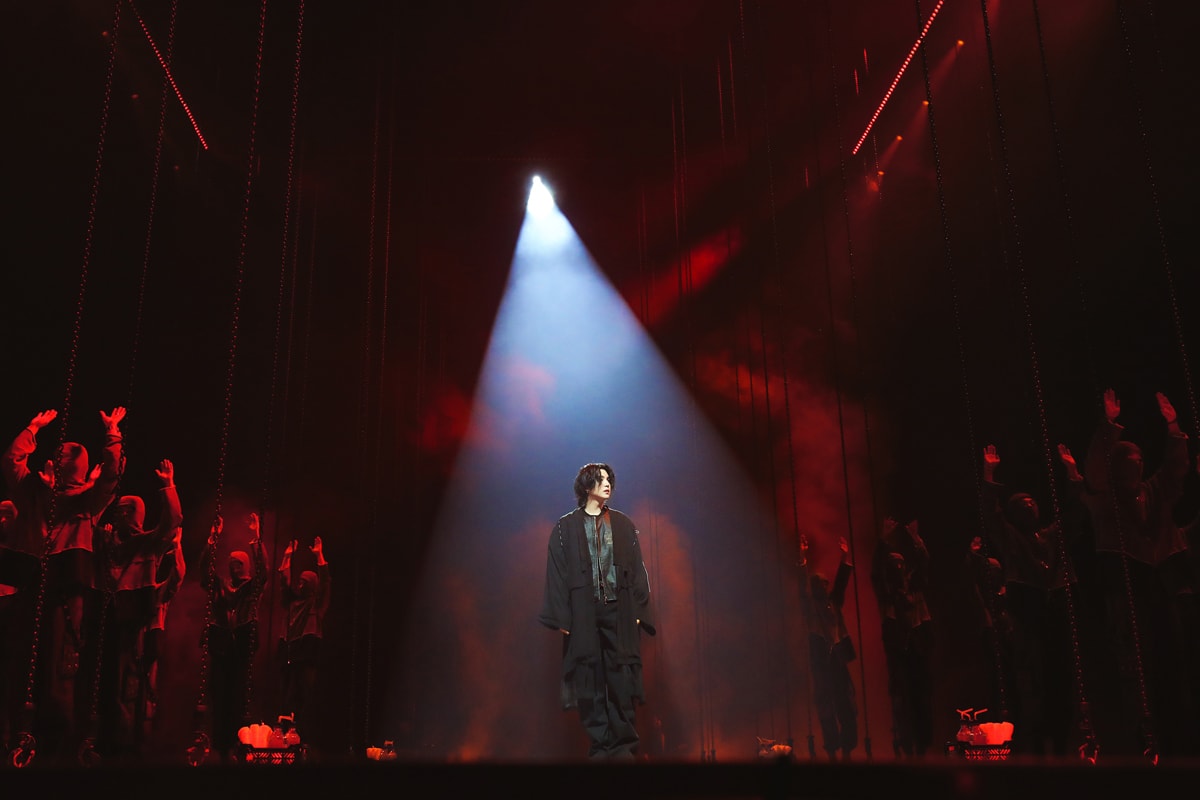 開演開始時刻の17時が過ぎ、会場には暗闇の中を大雨が降る映像が流れ…SUGAが過去に遭ったバイク事故を想起させる演出からライブはスタート! ダンサーたちに担がれて漆黒の衣装をまとったSUGAが登場し、そのままステージに寝かせられると『Haegeum』のイントロが流れ、魂の叫びのようにパワフルに歌い始めます。この時点でもう、彼の創り出す世界観に引き込まれ、もう戻れないほど深く沈められる感覚…。確かにそこにいるSUGAの存在に「キャー」と叫ぶ一方で、彼の醸し出す凄みとオーラには思わずハッと息をのむ。ああ苦しい、素敵過ぎて苦しい…。
