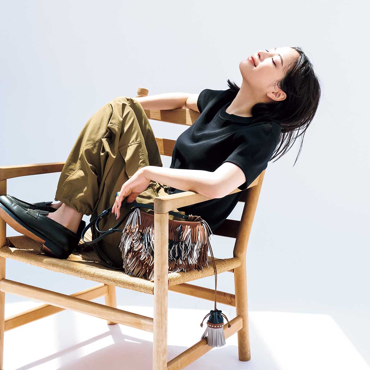 Tシャツ¥12,100(アストラット/アストラット 新宿店)パンツ¥47,300(ユニオン ランチ/サザビーリーグ)バッグ¥159,500チャーム¥39,600(ともにJ&M デヴィッドソン/J&M デヴィッドソン カスタマーセンター)靴¥137,500(ジェイエムウエストン/ジェイエムウエストン 青山店)リング人差し指上¥145,200下¥209,000中指¥231,000薬指¥113,300(すべてマリハ)
