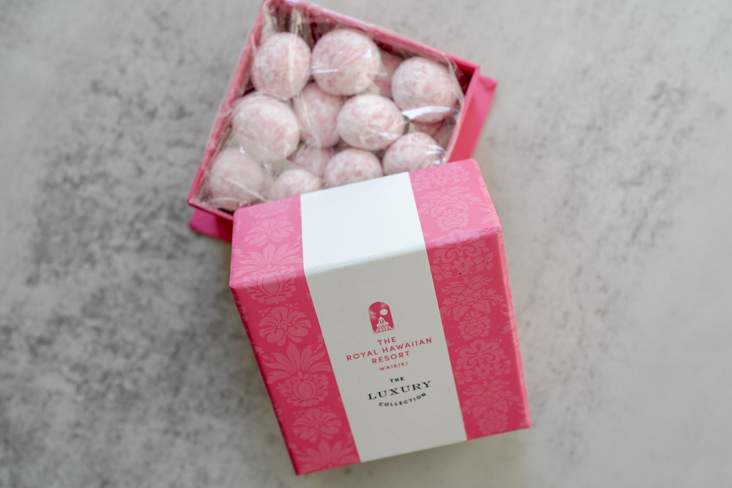 ホテルのベーカリーで見つけたピンクのパッケージに一目惚れして購入しました。パッケージだけでなく、中身までピンクでとっても可愛い!ホテルのコンセプトカラーのピンク色のチョコレートで、ハワイ産のマカダミアナッツをコーティング。サイズはSとLの2種類で、写真はSサイズです。