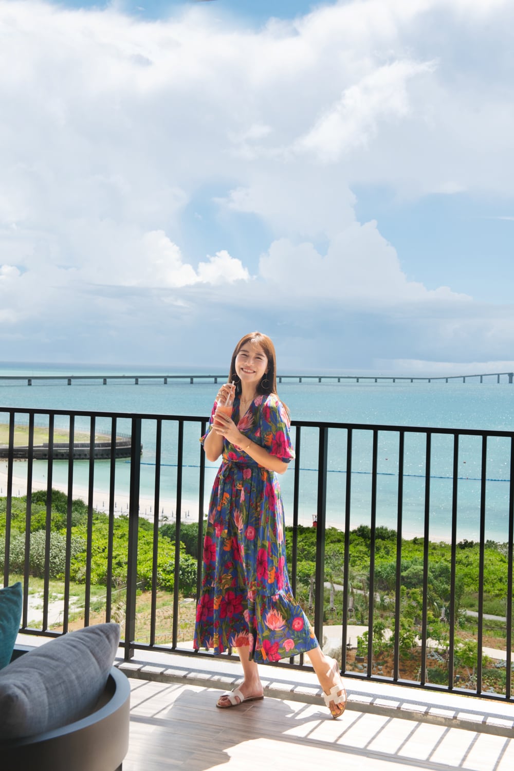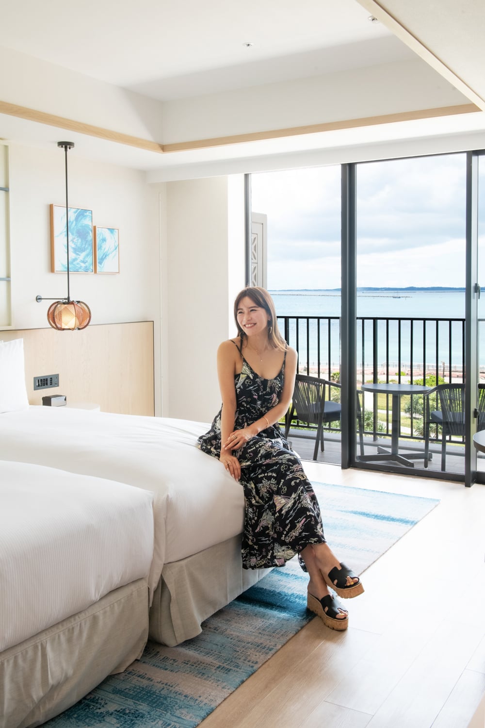 ホテルに着いたら、まずはお部屋でひと休み。宮古の自然や宮古ブルーの海をデザインに取り入れ、自然光がたっぷり注ぐお部屋からは宮古島の海が一望。「スタイリッシュだけどしっかりリラックスできる内装と大きな窓からのオーシャンビューはさすが! プライベートバルコニーも完備されているのが嬉しい。お部屋で過ごすだけで、あっという間に時間が経っていました!」(里奈ちゃん)