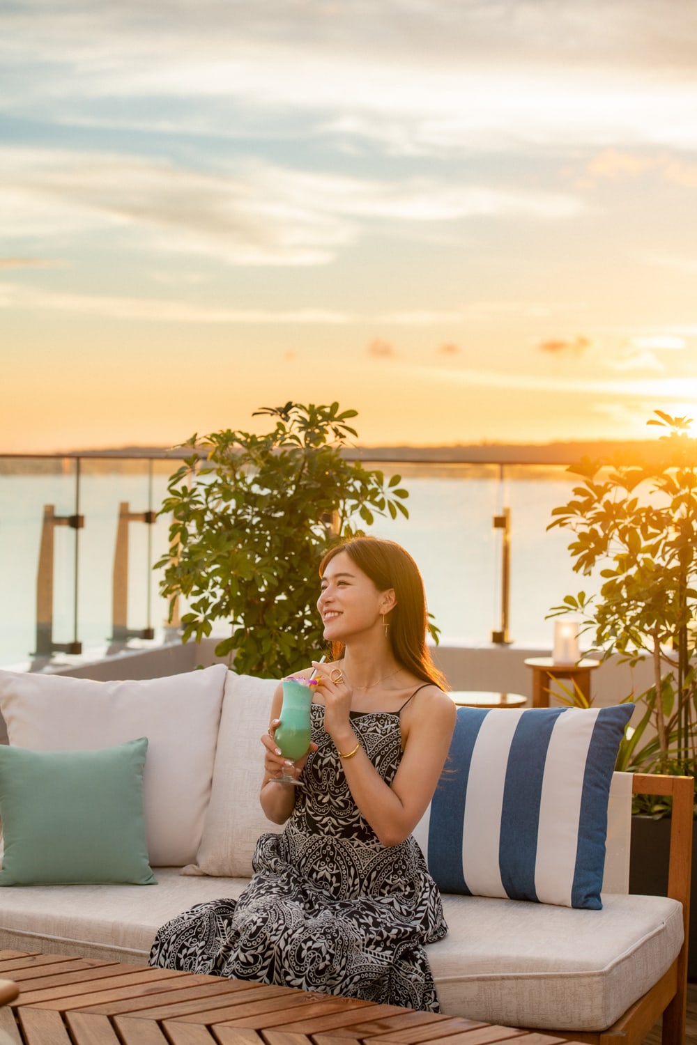 暑い日差しが和らいできたら、ルーフトップバー「YUNAI(ユナイ)」へ移動。サンセットを眺めながらフォトジェニックなオリジナルカクテル「宮古ブルー(¥1,800(税・サービス料込))」をいただきます!「到着してからはしゃぎっぱなしだったけれど(笑)この時ばかりはリラックス。刻一刻と移り変わる空の表情を眺めていると、本当に心から癒やされるんです」(里奈ちゃん)