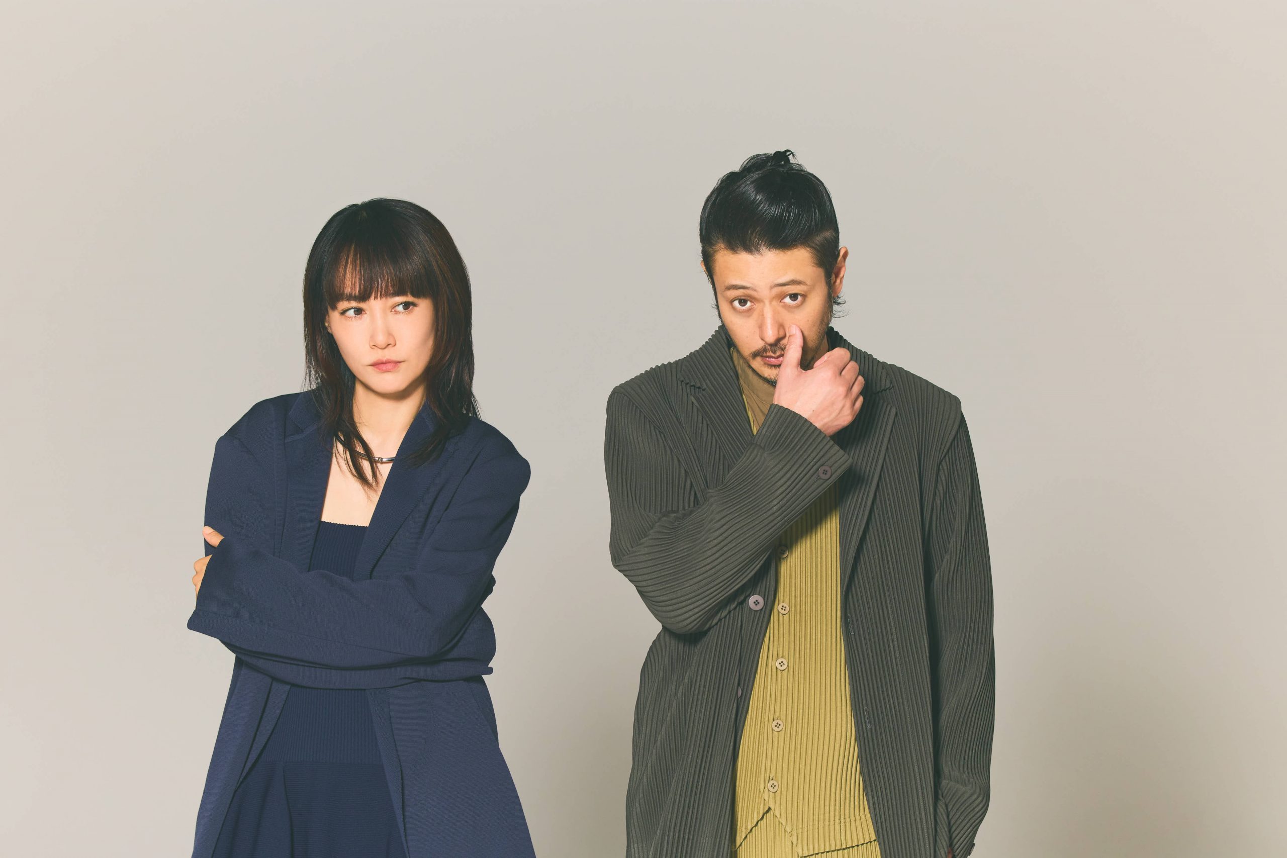 【菊地さん着用衣装】ジャケット¥86,900ジャンプスーツ¥63,800(ともにCFCL/CFCL Inc. support@cfcl.jp)その他/スタイリスト私物 【オダギリさん着用衣装】ジャケット¥60,500シャツ¥35,200ベスト¥26,400パンツ¥30,800(すべてISSEY MIYAKE/ISSEY MIYAKE 03-5454-1705)