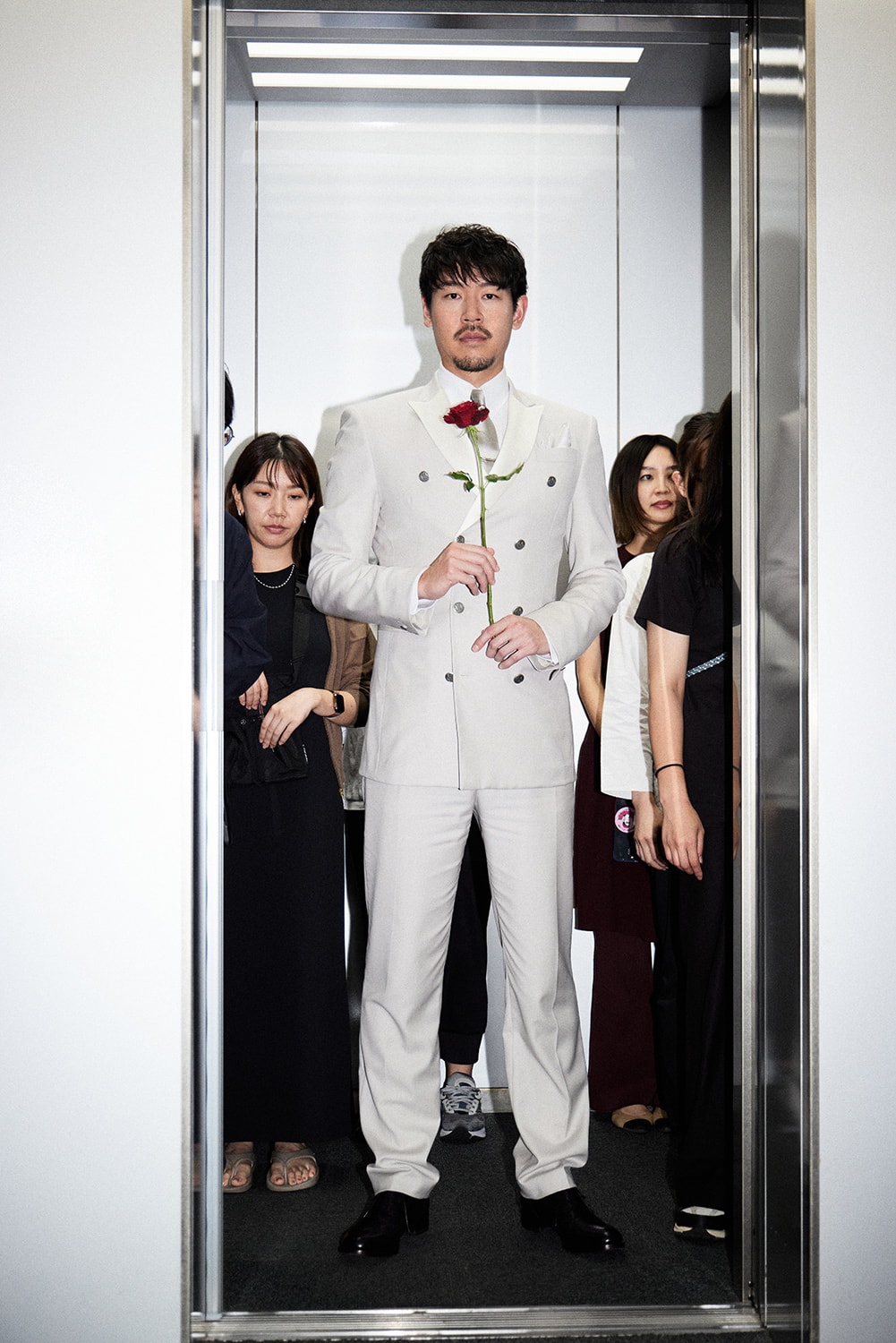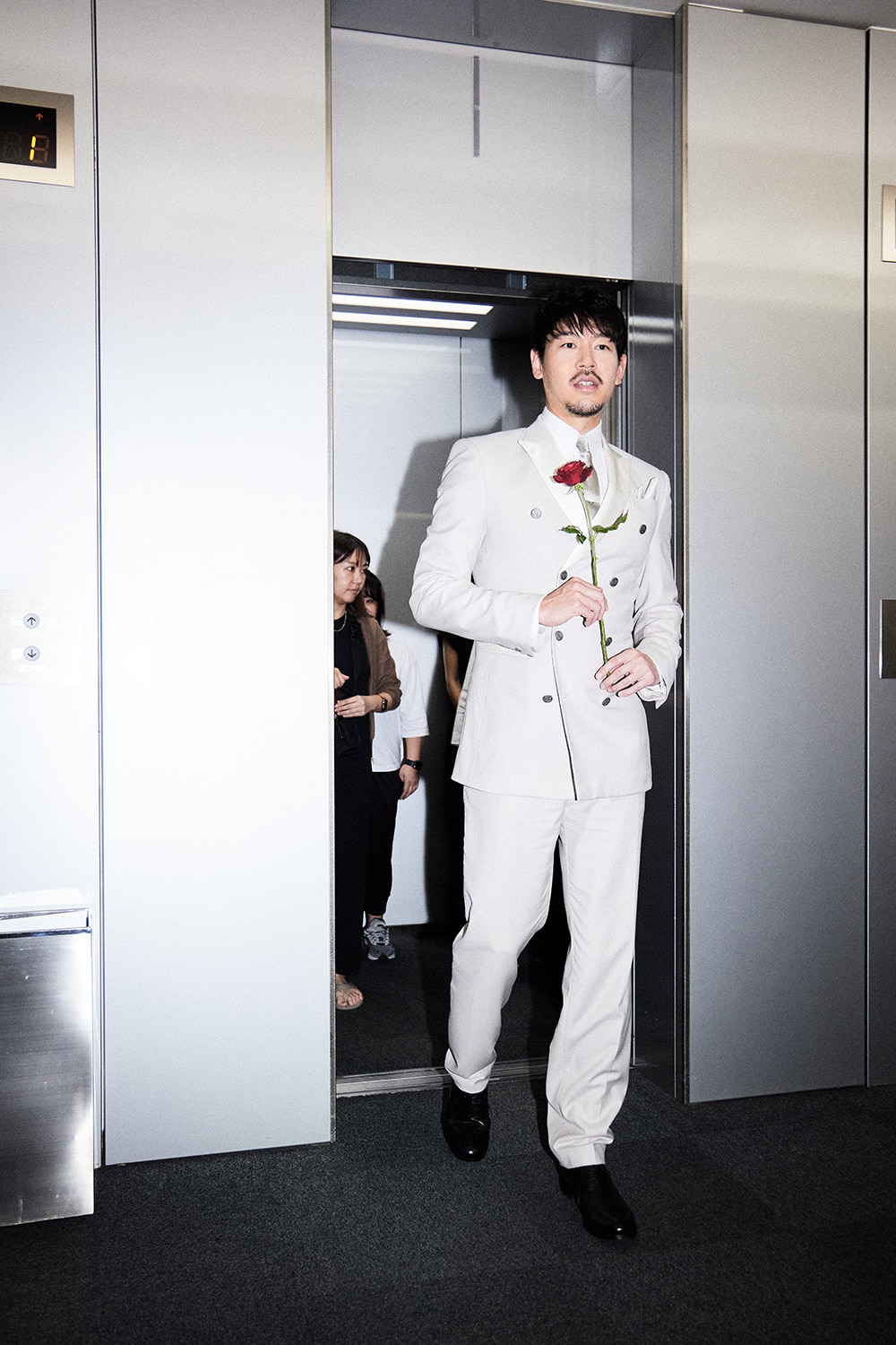 エレベーターが開き、5代目バチェラー・長谷川惠一氏は神妙な表情で登場…