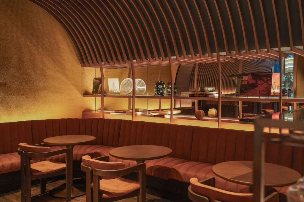 ホテルのコンセプトを反映した、曲線と直線を使ったスタイリッシュな店内のデザイン。バーカウンターの奥にはゆったりと過ごせるソファ席も。パクチーやレッドペッパーを使ったタイらしいものから、日本酒や紫蘇などを使った日本らしいものまで、オリジナルのカクテルがおすすめです。