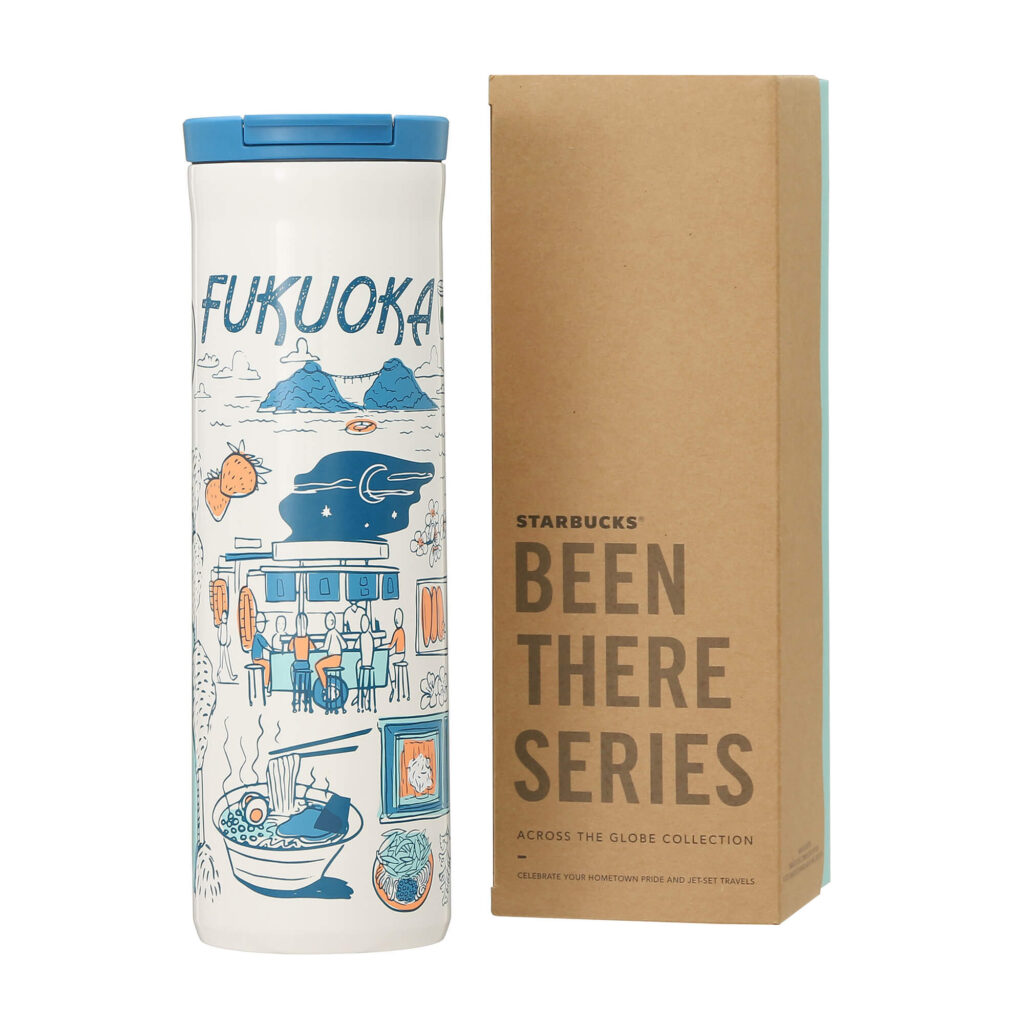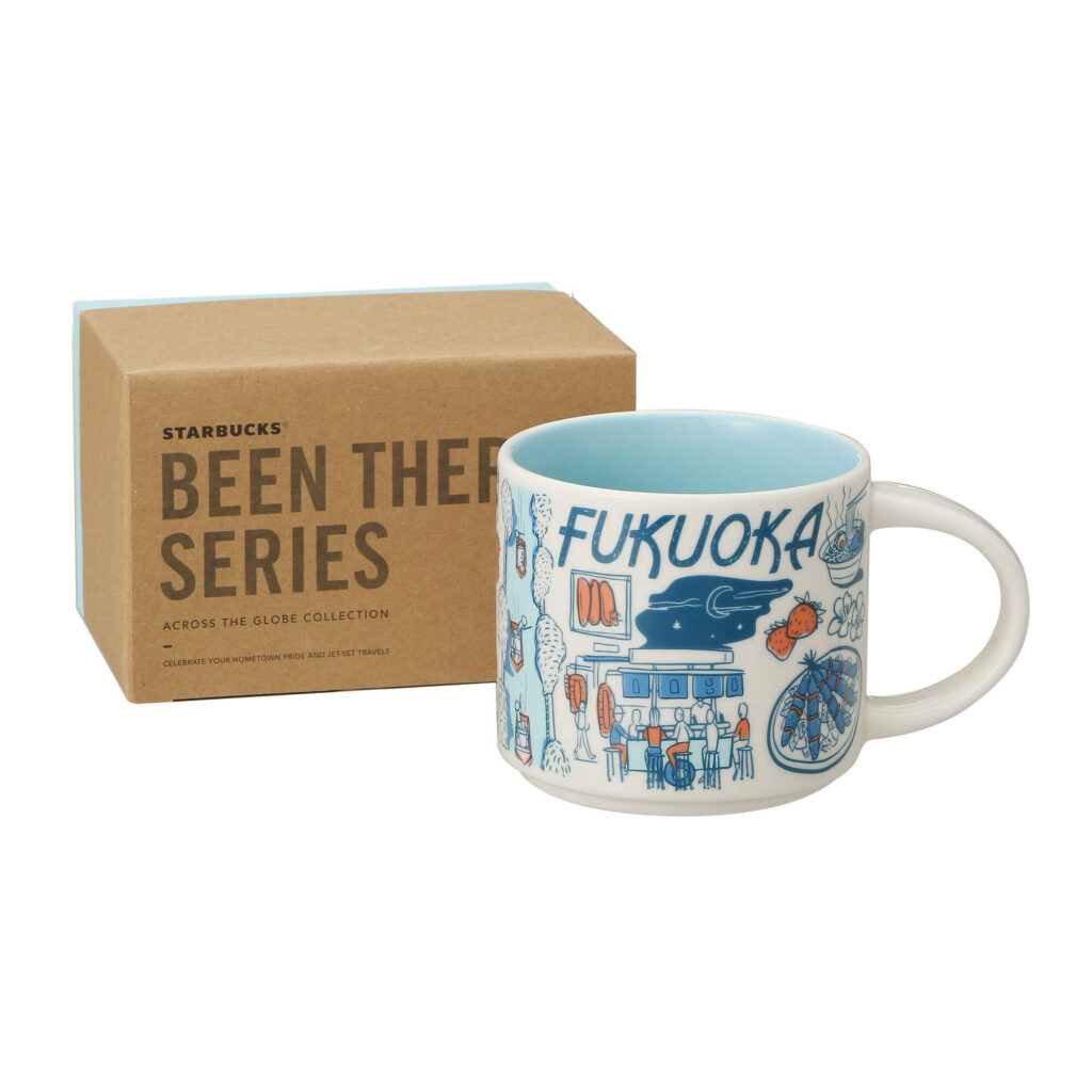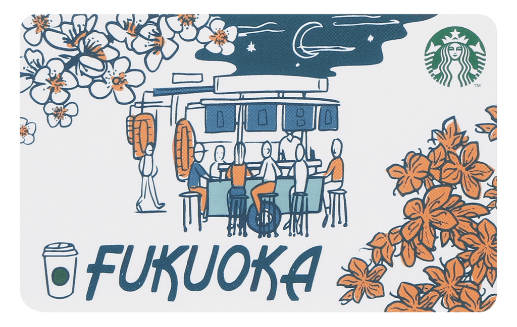 世界各地のスターバックスで展開されている「Been There Series」のFUKUOKAデザインです。福岡ならではの活気ある屋台の様子や名所、自然あふれる景色をイメージしてデザインされています。博多ラーメン、明太子、皿倉山、川下りなど、福岡らしいモチーフをたくさん散りばめています。キーカラーは自然をイメージした青と、人々の活気をイメージしたオレンジです。