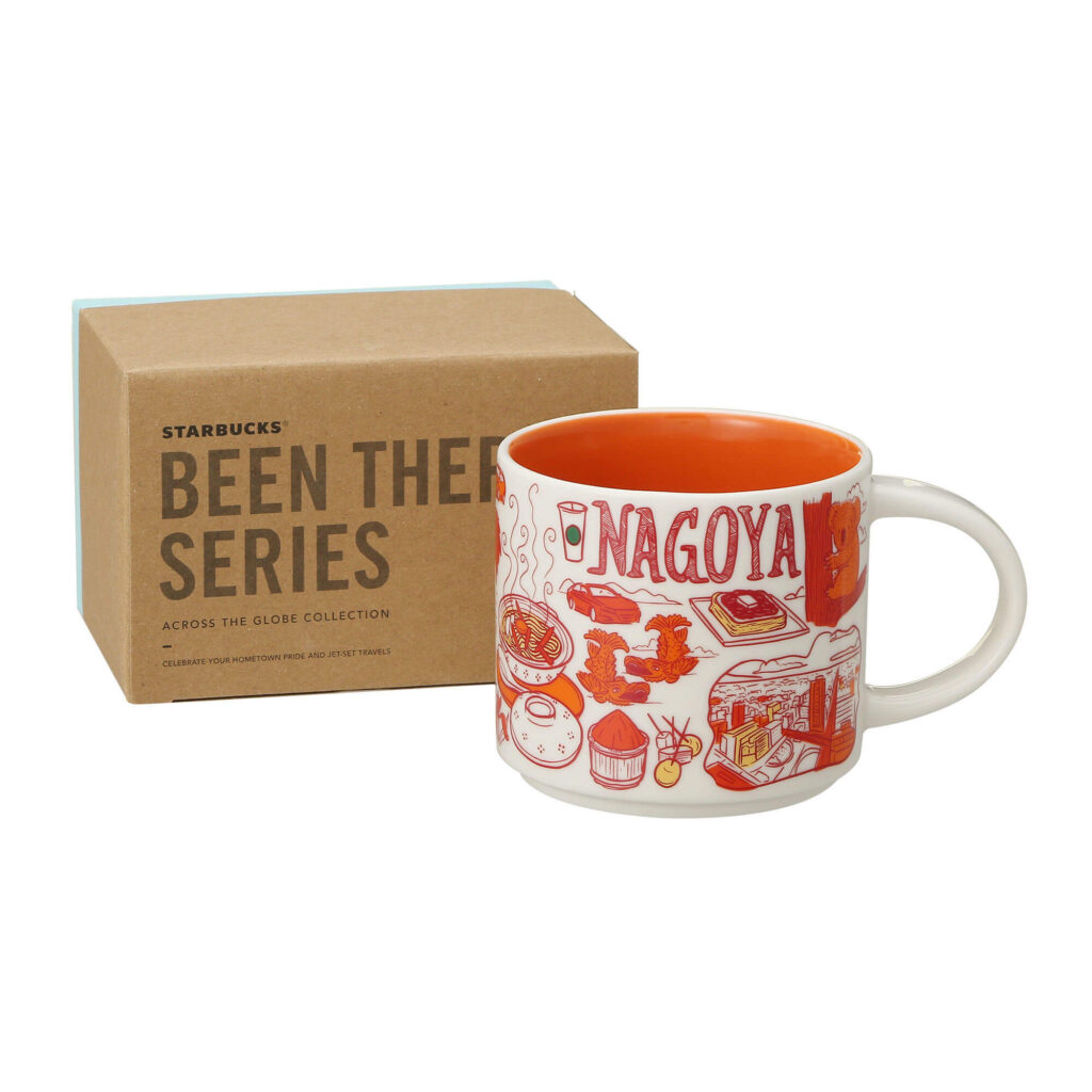 世界各地のスターバックスで展開されている「Been There Series」のNAGOYAデザインです。きらびやかで華やか、そしてグルメな名古屋の街をイメージしてデザインされています。しゃちほこ、高層ビルから見える景色、小倉トースト、味噌煮込みうどんなど、名古屋らしいモチーフをたくさん散りばめています。キーカラーは華やかで明るい雰囲気をイメージした赤とオレンジです。