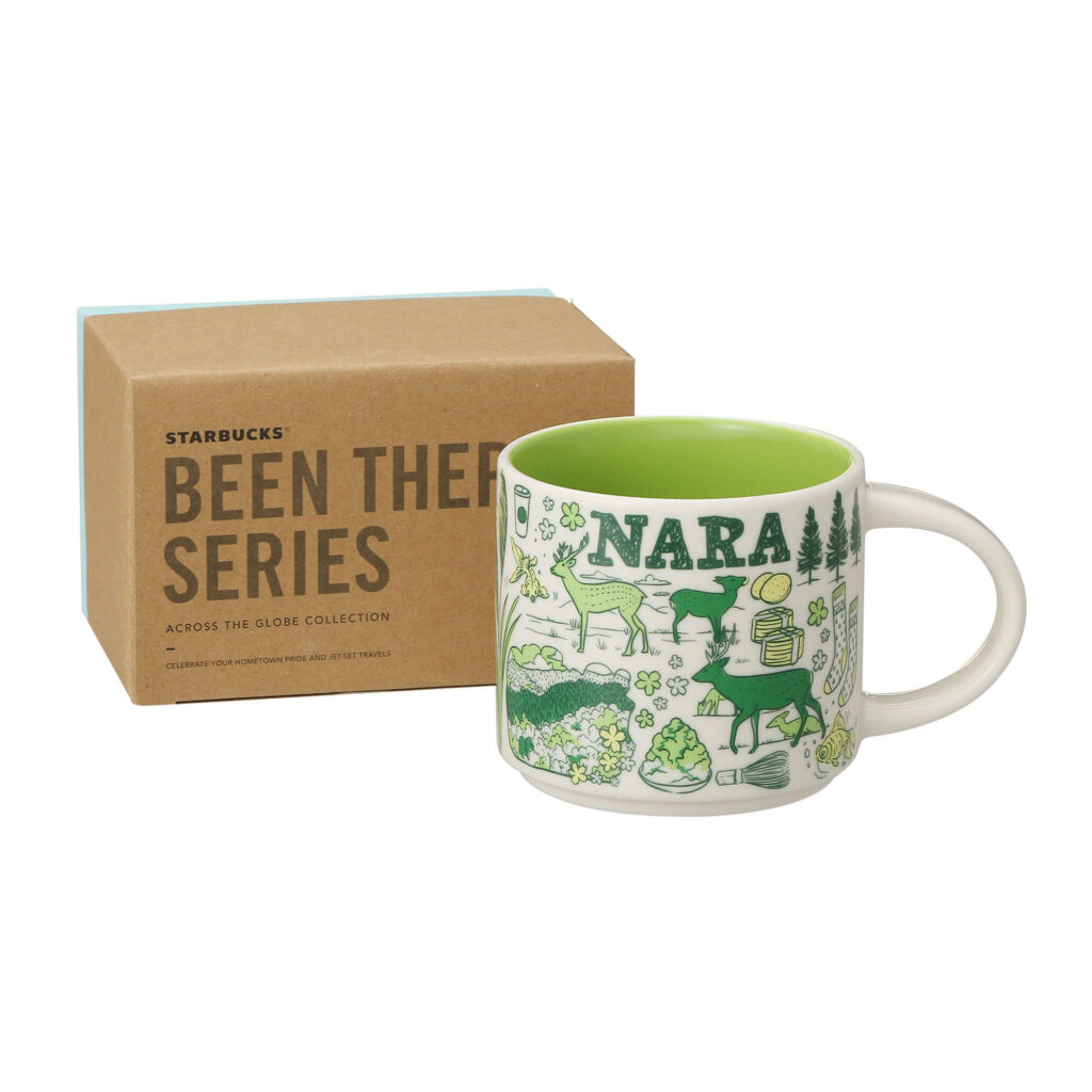 世界各地のスターバックスで展開されている「Been There Series」のNARAデザインです。古くからの景色とそこに流れる穏やかな空気をイメージしてデザインされています。かわいらしい鹿、吉野桜、草原、かき氷、奈良漬けなど、奈良らしいモチーフをたくさん散りばめています。キーカラーは穏やかな自然をイメージした緑と黄緑です。
