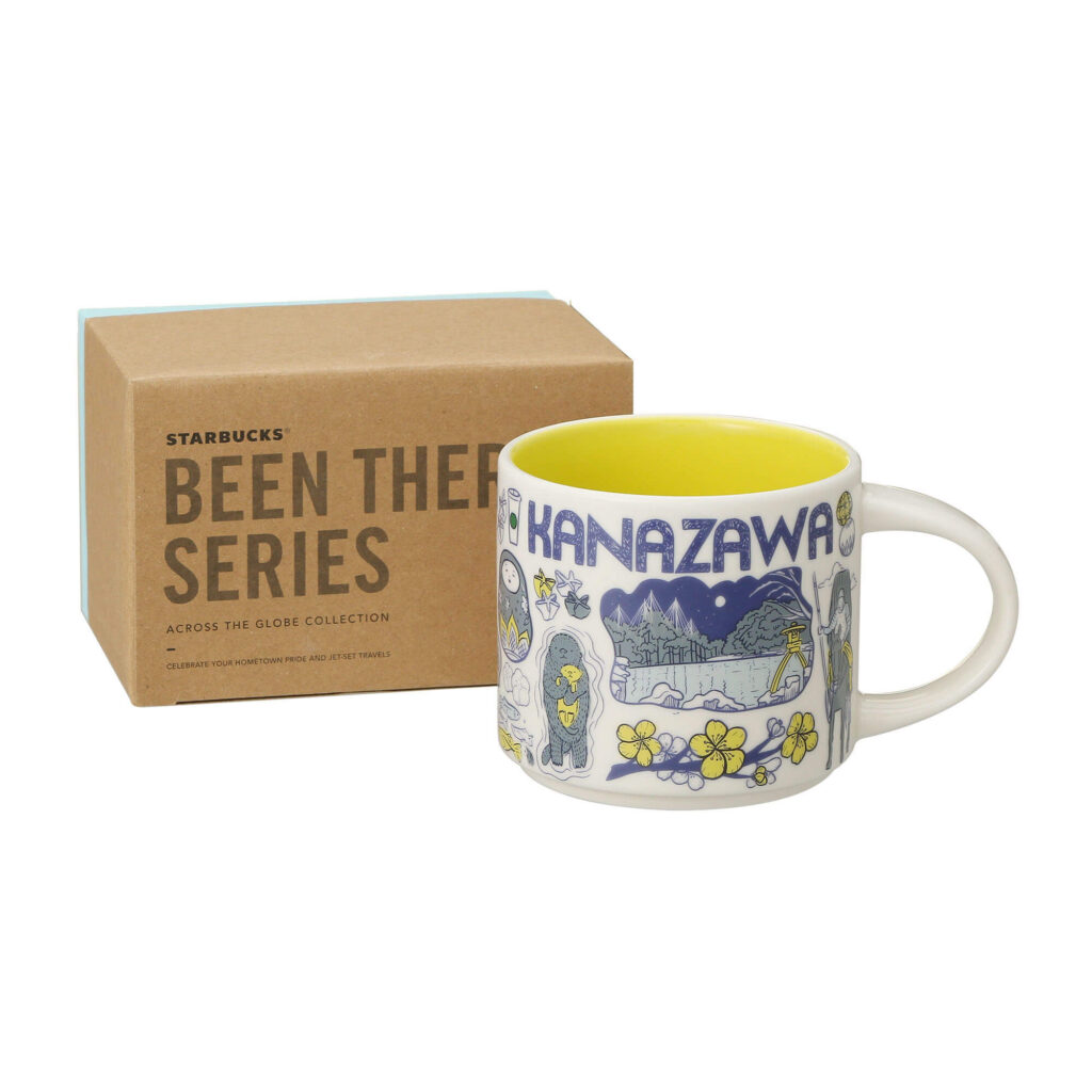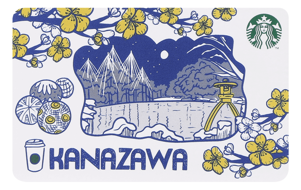 世界各地のスターバックスで展開されている「Been There Series」のKANAZAWAデザインです。金沢の美しい街並みと文化、歴史が受け継がれている様子をイメージしてデザインされています。冬の兼六園、金沢百万石まつり、姫だるま、手毬など、金沢らしいモチーフをたくさん散りばめています。キーカラーは洗練された印象の濃紺と黄色です。