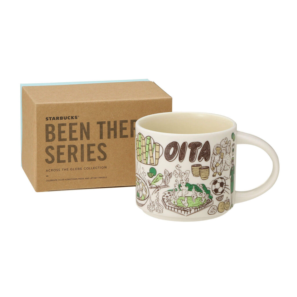 世界各地のスターバックスで展開されている「Been There Series」のOITAデザインです。大分の有名な温泉街とゆったりとした街の雰囲気をイメージしてデザインされています。湯気に包まれた温泉、浴衣で歩くカップル、団子汁、とり天など、大分らしいモチーフをたくさん散りばめています。キーカラーは自然をイメージした緑とゆったりとした時間が流れる印象のベージュです。