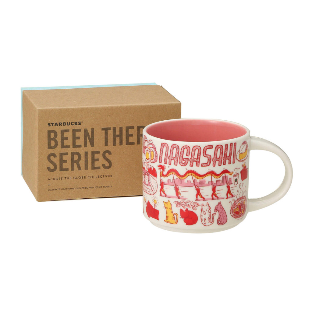 世界各地のスターバックスで展開されている「Been There Series」のNAGASAKIデザインです。活気ある街並みと異国情緒の文化が入り混じる情景をイメージしてデザインされています。龍踊り、長崎ちゃんぽん、オランダ坂、眼鏡橋など、長崎らしいモチーフをたくさん散りばめています。キーカラーは色鮮やかな街の雰囲気をイメージした赤とピンクです。
