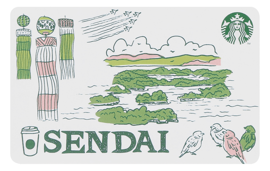 世界各地のスターバックスで展開されている「Been There Series」のSENDAIデザインです。杜の都といわれる緑あふれる風景をイメージしてデザインされています。松島やけやき並木の風景、七夕祭り、名産の牡蠣や笹かまぼこなど、仙台らしいモチーフをたくさん散りばめています。キーカラーは豊かな木々をイメージした緑と優しい印象のピンクです。