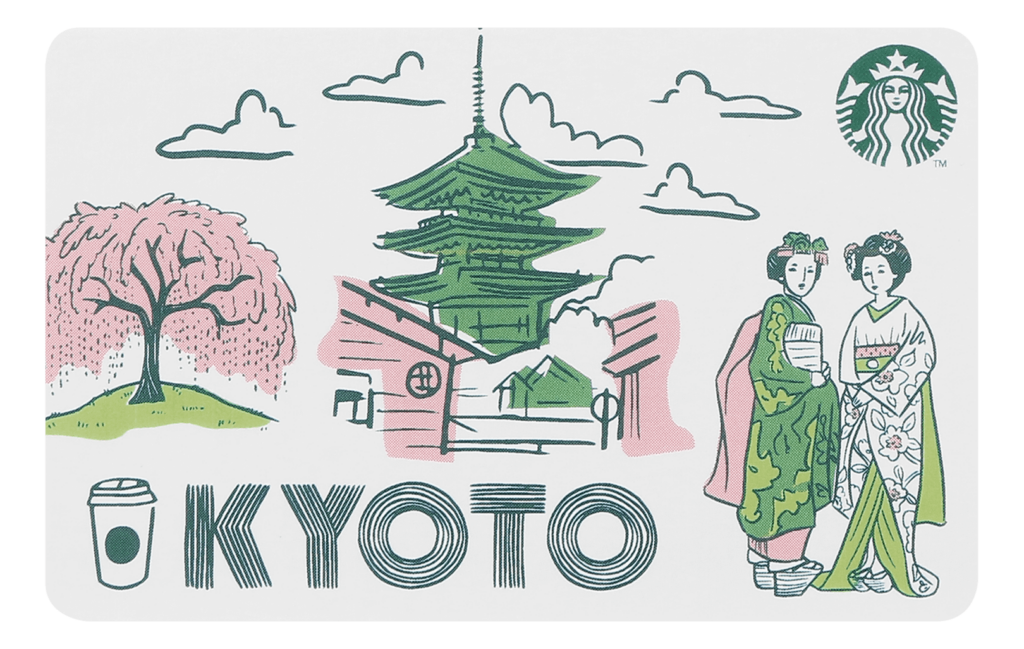 世界各地のスターバックスで展開されている「Been There Series」のKYOTOデザインです。歴史や文化、自然が共存する京都の美しい情景をイメージしてデザインされています。華やかな舞妓さん、鴨川のカップル、枯山水、生八つ橋など京都らしいモチーフをたくさん散りばめています。キーカラーは自然をイメージした緑と、京のはんなりとした美しさをイメージしたピンクです。