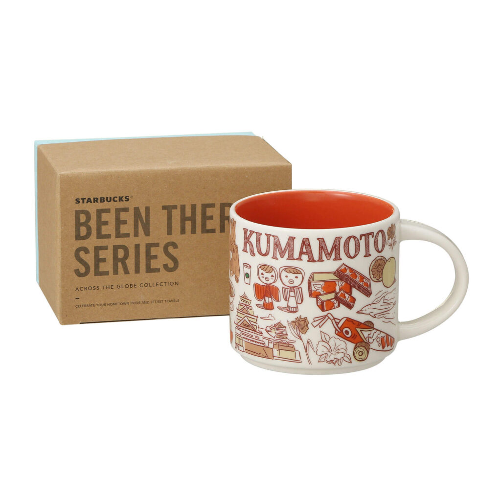 世界各地のスターバックスで展開されている「Been There Series」のKUMAMOTOデザインです。雄大な自然と愛らしい動物たちをイメージしてデザインされています。緑豊かな風景に建つ熊本城、阿蘇の景色、晩白柚、タイピーエン、イルカウォッチングなど、熊本らしいモチーフをたくさん散りばめています。キーカラーはあたたかみのあるオレンジと広大な自然、素朴さをイメージしたベージュです。