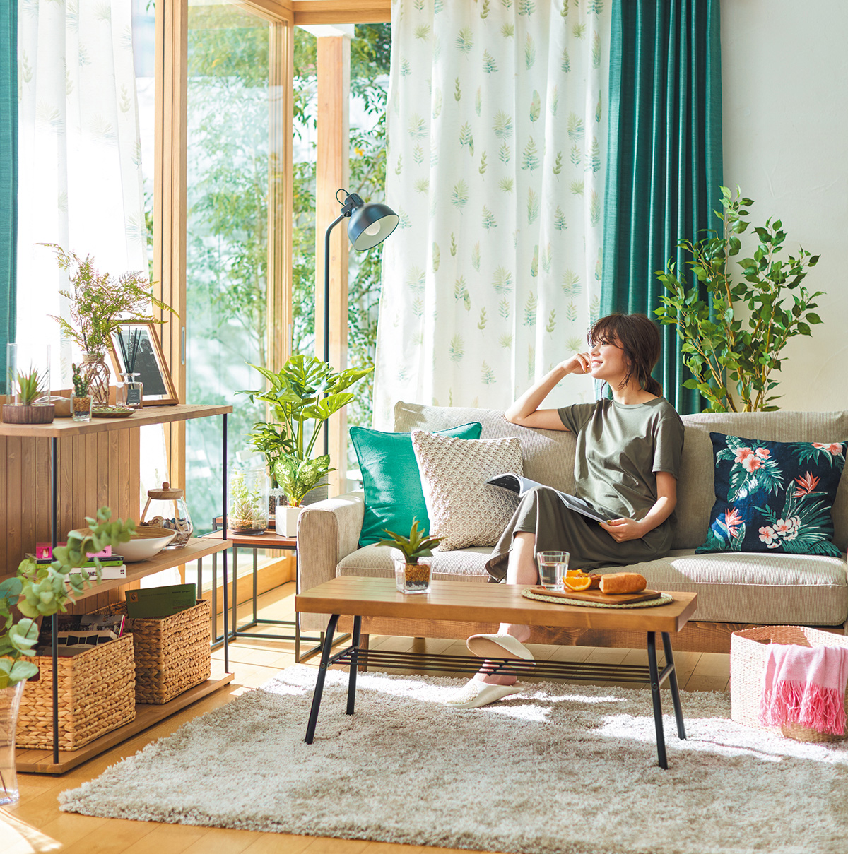 グリーンをベースにした鮮やかで開放感に溢れた雰囲気が気持ちいい。ニトリなら夏らしいアイテムが豊富に揃っているから、目指すコーディネートが簡単に叶う!トロピカルな要素を少し加えて、遊び心のアクセントも忘れずに。