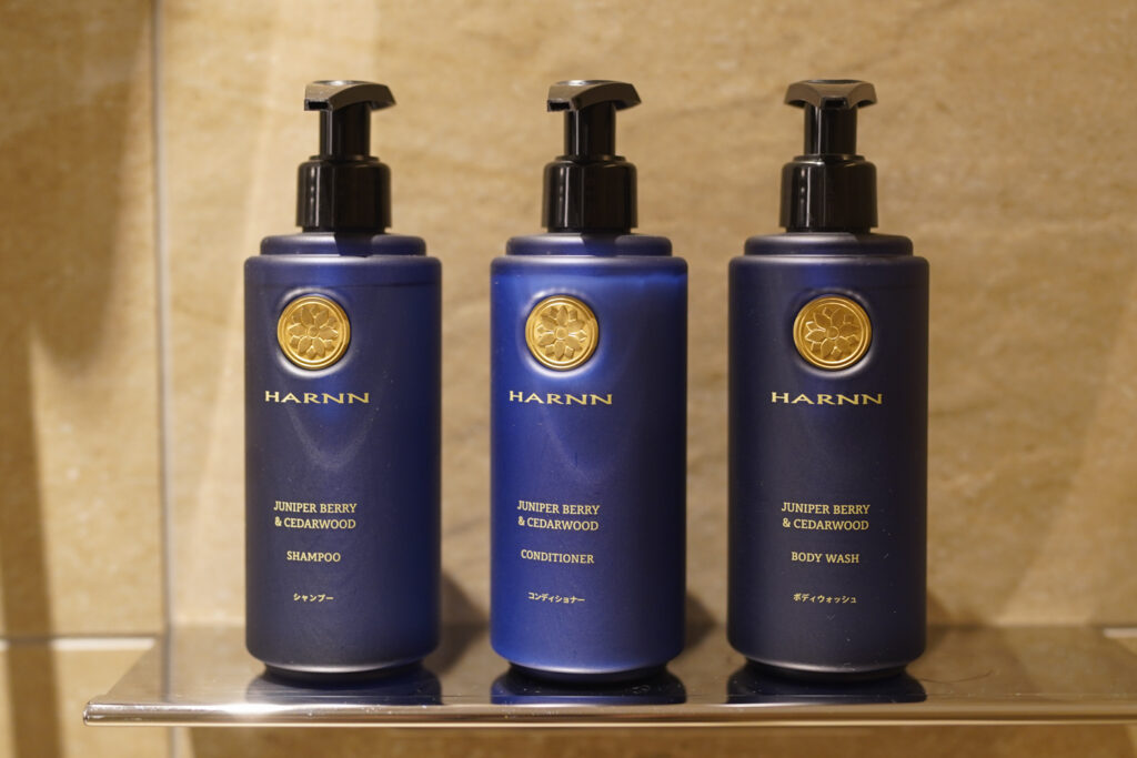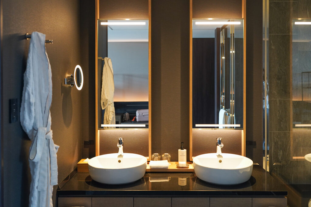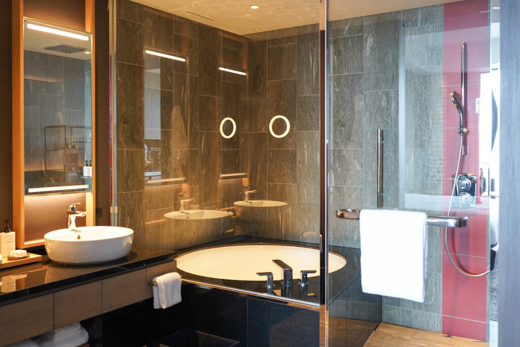 写真の客室は「プレミアルーム」。広さは40㎡、眺望は写真のコートヤードビュー又はシティビューの2種類です。木と石を基調に黒をプラスした和モダンスタイルのインテリア。石でつくられた高級感漂うバスタブに、ハンドシャワーとレインシャワー、さらにダブルシンク完備と、見た目だけでなく機能性も◎。