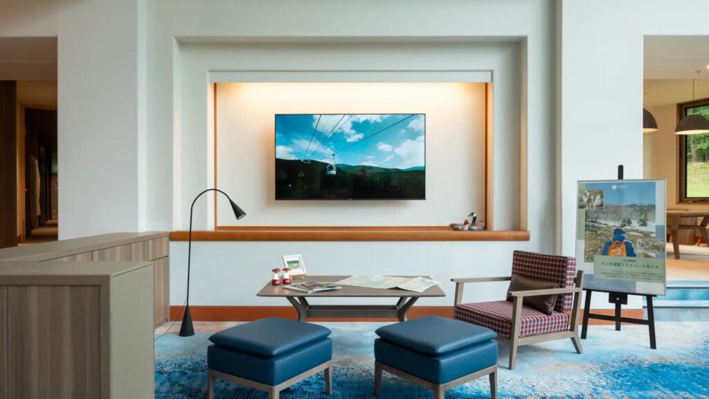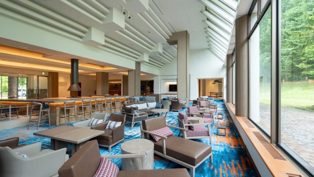ホテルは、周辺の自然環境との境界線をできる限り無くしたデザインにされており、あらゆるシーンで大自然を感じられるような設計に。大自然の景色が全面ガラス張りの窓に広がるエントランスロビーや、シンボリックなファイヤープレイスを囲む落ち着いた雰囲気のバーカウンターは必見です。また、1階レセプション横にあるアクティビティセンターでは、この時期ならではの裏磐梯の楽しみ方や旅程を提案。ホテル全体で裏磐梯の自然を満喫できるようコーディネートされています。
