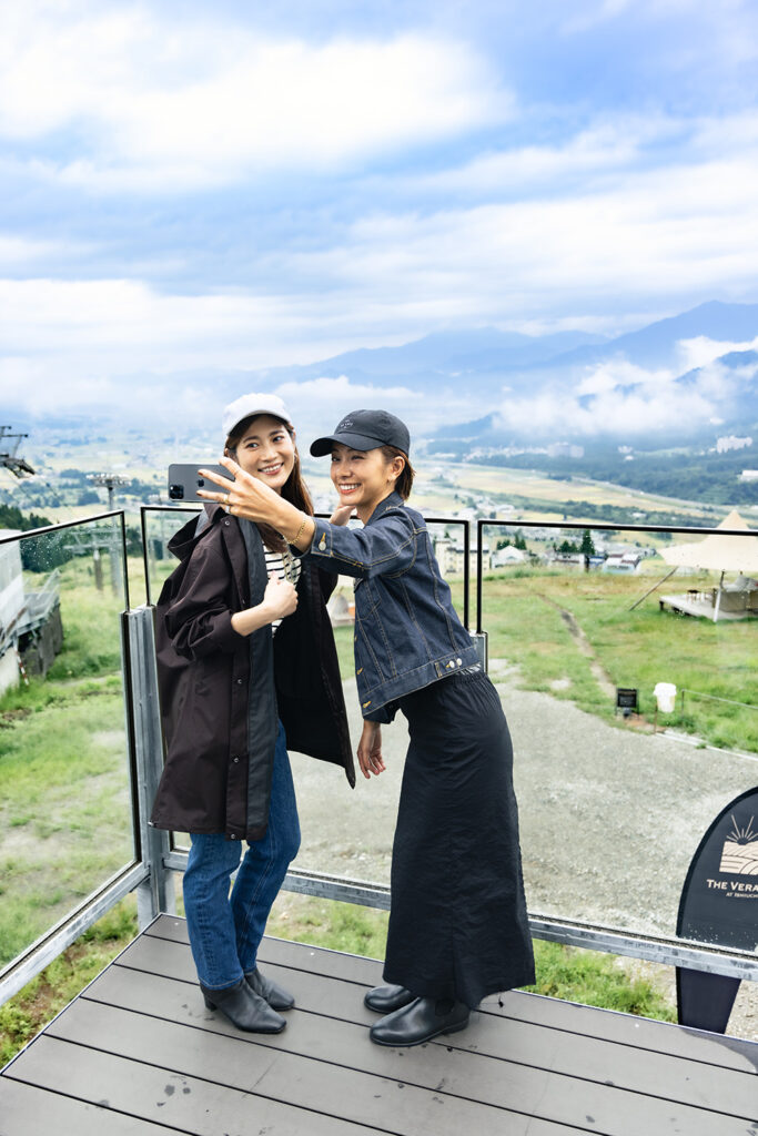まずゴンドラに乗ってみると、眺望のよさに驚き!最新鋭のゴンドラは高性能で静かで速いだけでなく、ガラス面が大きくて眺望や写真映りも抜群です。登っていくにつれて、越後の雄大な山々と魚沼平野の眺望がどんどんダイナミックに変化。ちょっぴり高所恐怖症で不安がっていた黒島さんも、「揺れが少なくて速くてとても静か!安心して乗れたし、眺望が美しすぎてあっという間でした!」と話してくれました。