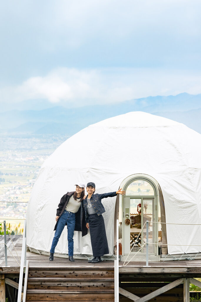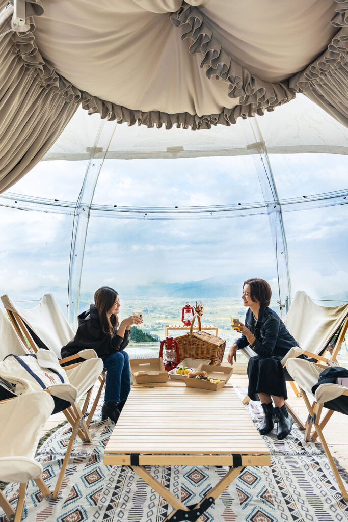 お昼はお楽しみイベントのひとつ!オシャレなドームテントを貸し切って贅沢にランチをいただく、グランピング体験ができます。スタイリッシュなテントから臨む石打丸山の大自然はまた違った魅力で、他にはないフォトジェニックな空間に。冷暖房やWi-Fiまで完備しているので、1年を通して快適に過ごせます。「冬期はドームテントのカバーが外されて透明にチェンジして、屋根まで360°透明なドームになるそう。リピートして四季の景色を観てみたくなります!」「とにかく映えるので女子会やアニバーサリーにもよさそう」という2人の声も!