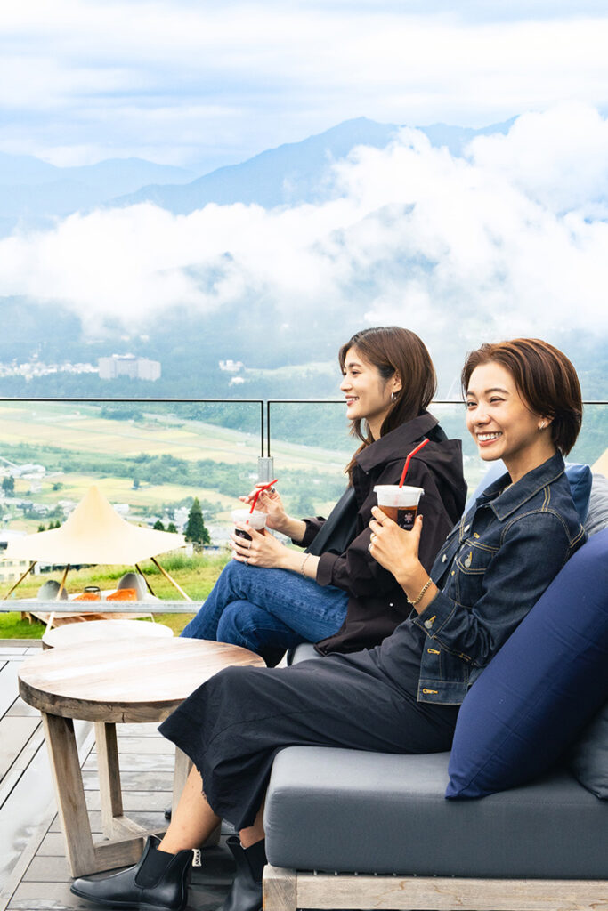 東京スカイツリーとほぼ同じ高さに位置する、標高約600mの山頂に到着しゴンドラを降りると、空気の清涼さと魚沼盆地の雄大なパノラマに感動の2人。展望テラスは大自然がシームレスに繋がる設計になっているので、山の斜面から続く平地まで美しい自然の景色を一望できます。日本有数の米どころ、南魚沼の田園風景が目の前に広がり、その先に日本百名山の巻機山を含む越後三山が連なる様子は圧巻です。絶景を眺めながら思い切り深呼吸したり、記念写真を撮ったり、カフェのテラスで休憩するのもよし。「とにかく空気と水がキレイで、まったりするだけで気持ちのよい場所です。本格的なコーヒーはぜひ味わって欲しい!」と話してくれました。