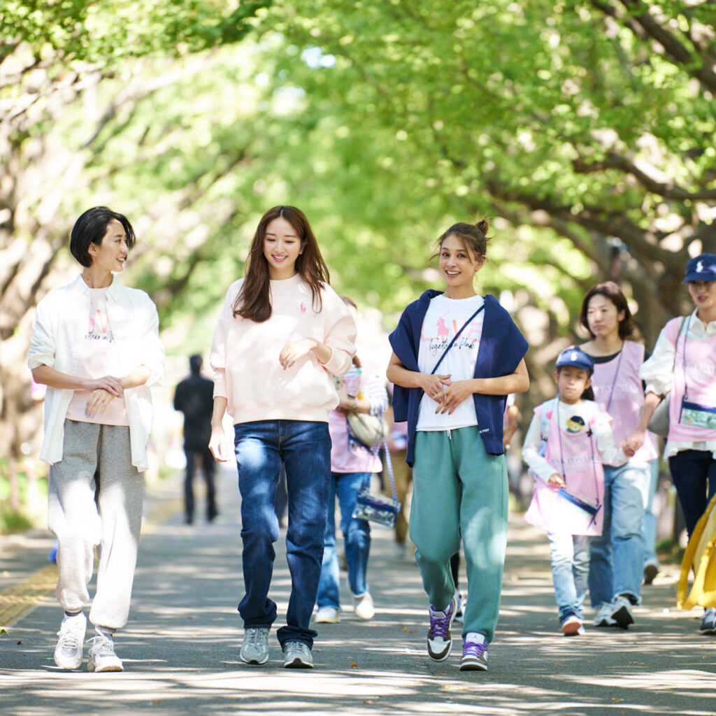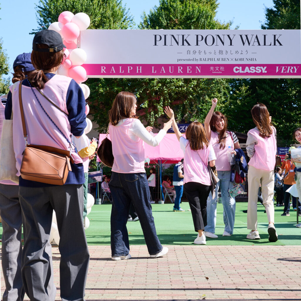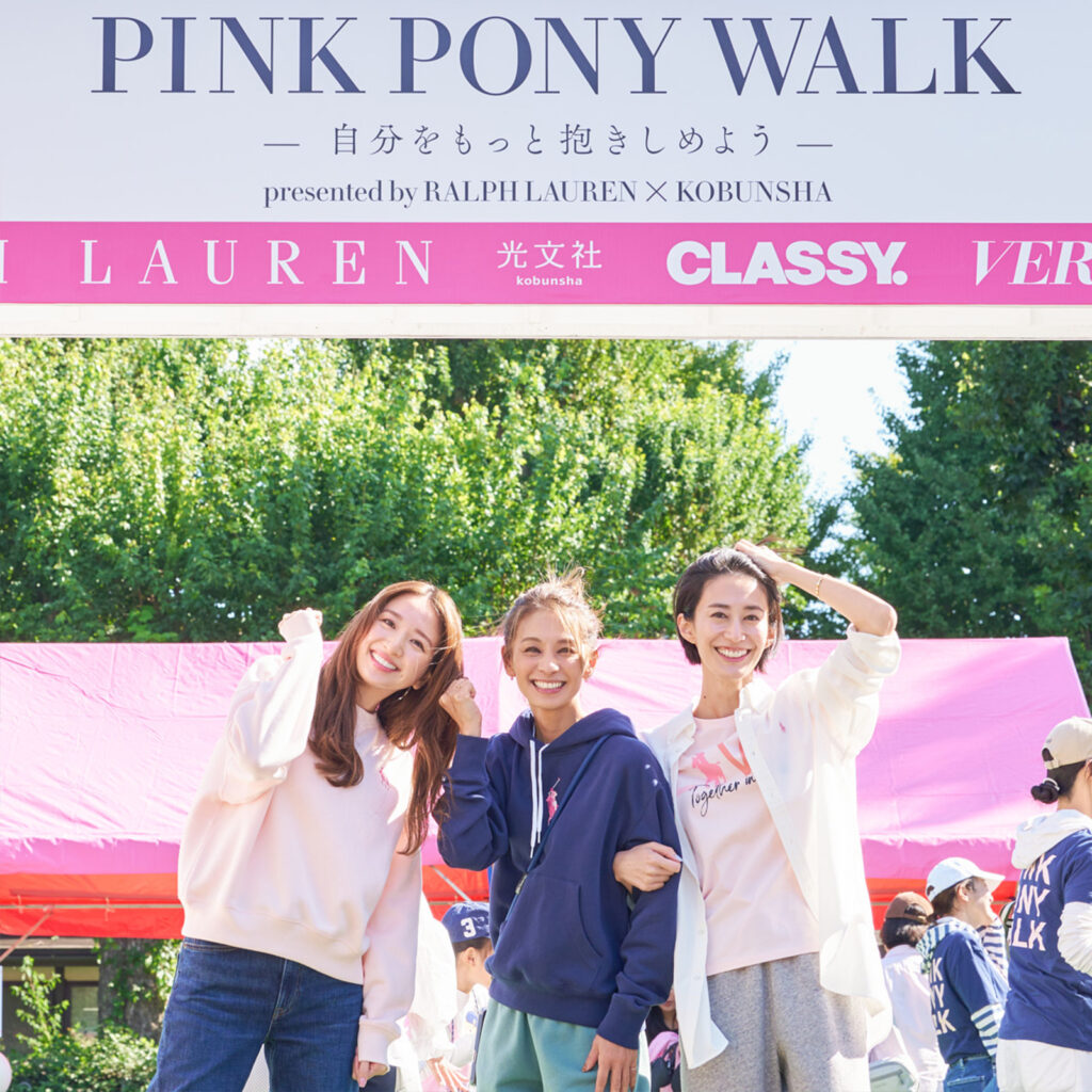 株式会社光⽂社は、⽉刊誌『CLASSY.』『VERY』『STORY』『美ST』との4誌連合で、「⾃分をもっと抱きしめよう」をテーマに、“乳がん検診”を啓発するキャンペーンを⾏っています。その⼀環として、乳がん検診や⽇ごろから健康に向き合う⼤切さを啓発することを⽬的に、ラルフ ローレンと合同で、ウォーキングイベント“PINK PONY WALK”を開催しました。
