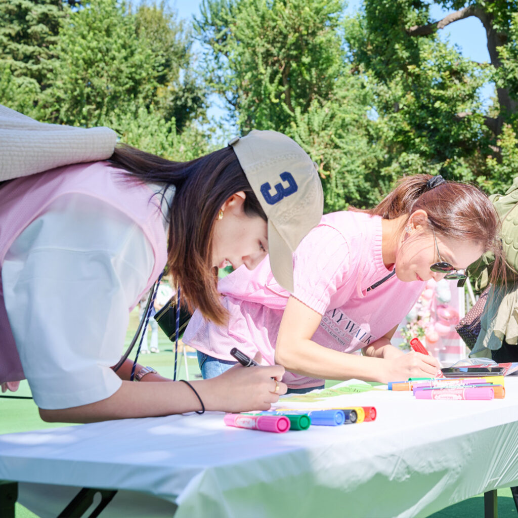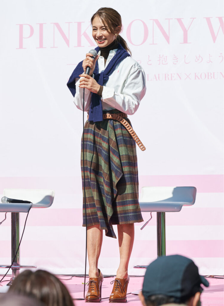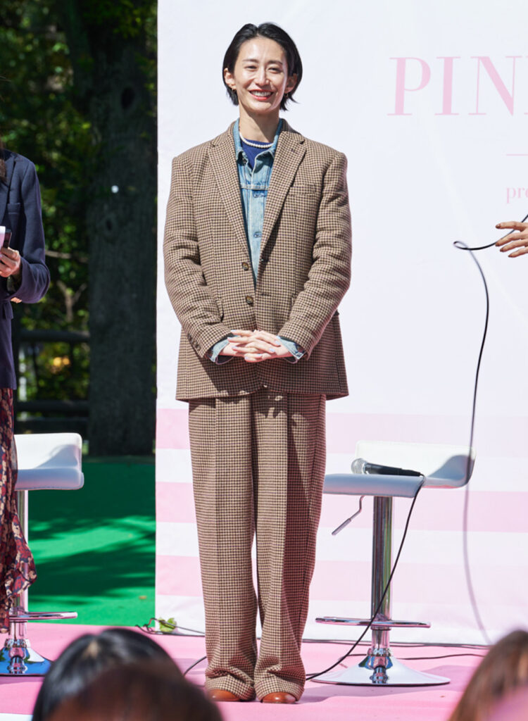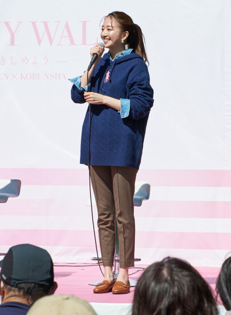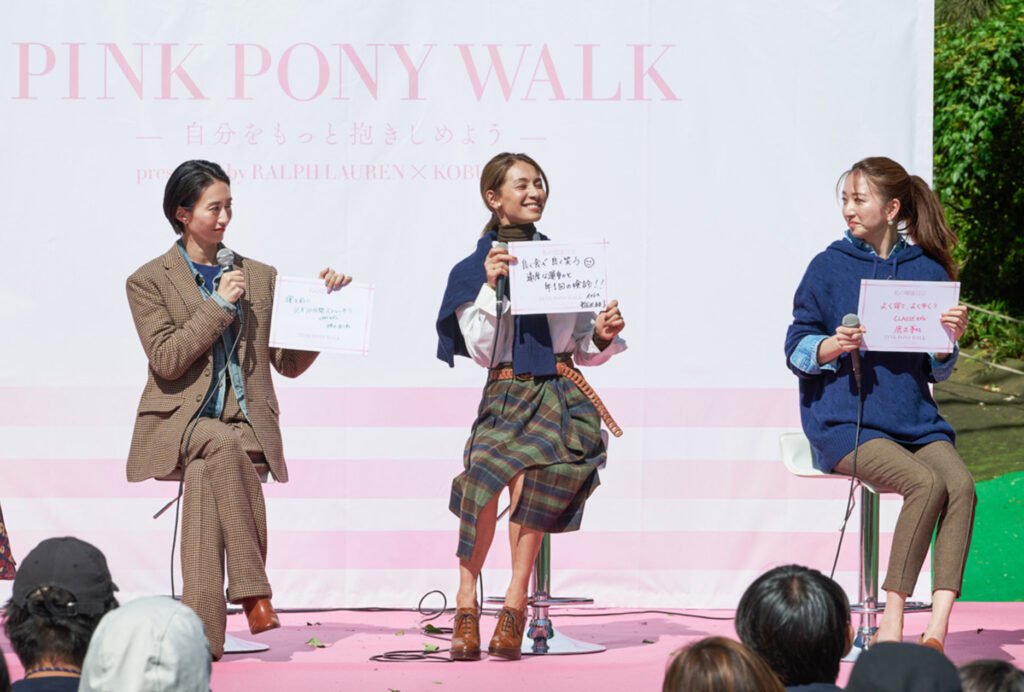ウォーキングイベントに続いて⾏われたトークショーでは、フリーアナウンサーの笹川友⾥さんを司会に、『CLASSY.』モデル・⿅沼憂妃さん、『VERY』モデル・神⼭まりあさん、『STORY』モデル・稲沢朋⼦さんがスピーカーとして出演。がんの研究、検診、早期診断、治療、教育、キャンサーナビゲーションのためのプログラムである“ピンク ポニーイニシアティブ”を⽀援する「ピンク ポニー コレクション」の⾐装に⾝を包み登壇し、がん検診の⼤切さについて語り合いました。
