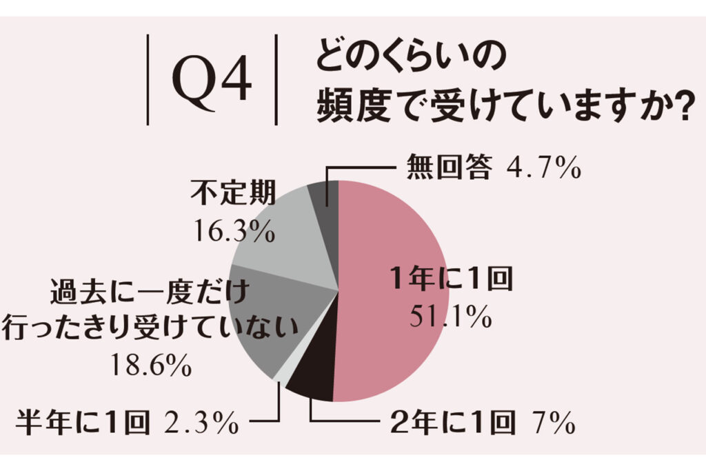 →【1年に1回】51.1%、【2年に1回】7%、【半年に1回】2.3%、【過去に一度だけ行ったきり受けていない】18.6%、【不定期】16.3%、【無回答】4.7%