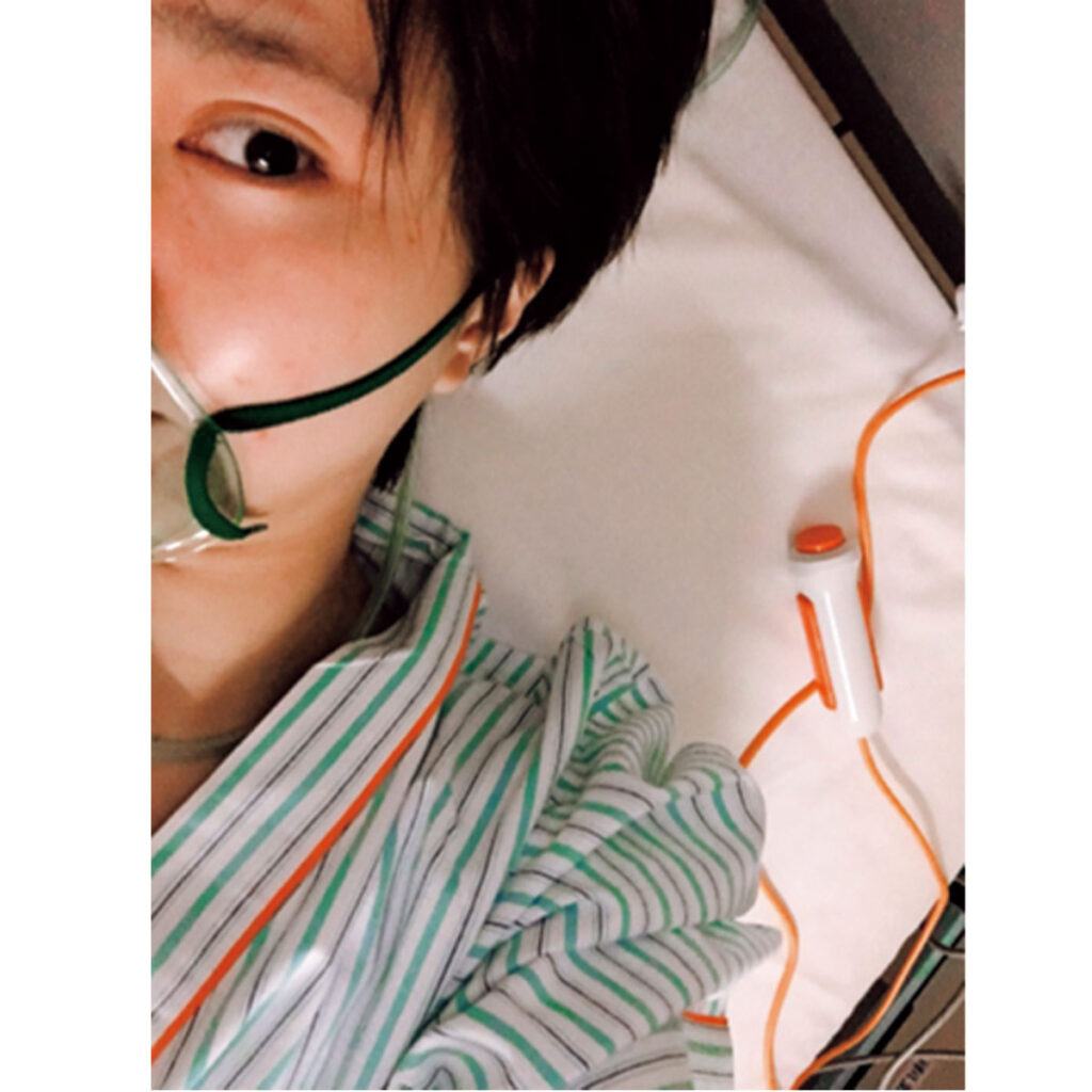 左乳房とリンパ節を摘出した手術が終わり、麻酔から目覚めた直後。まだ酸素マスクをつけている状態の一枚です。