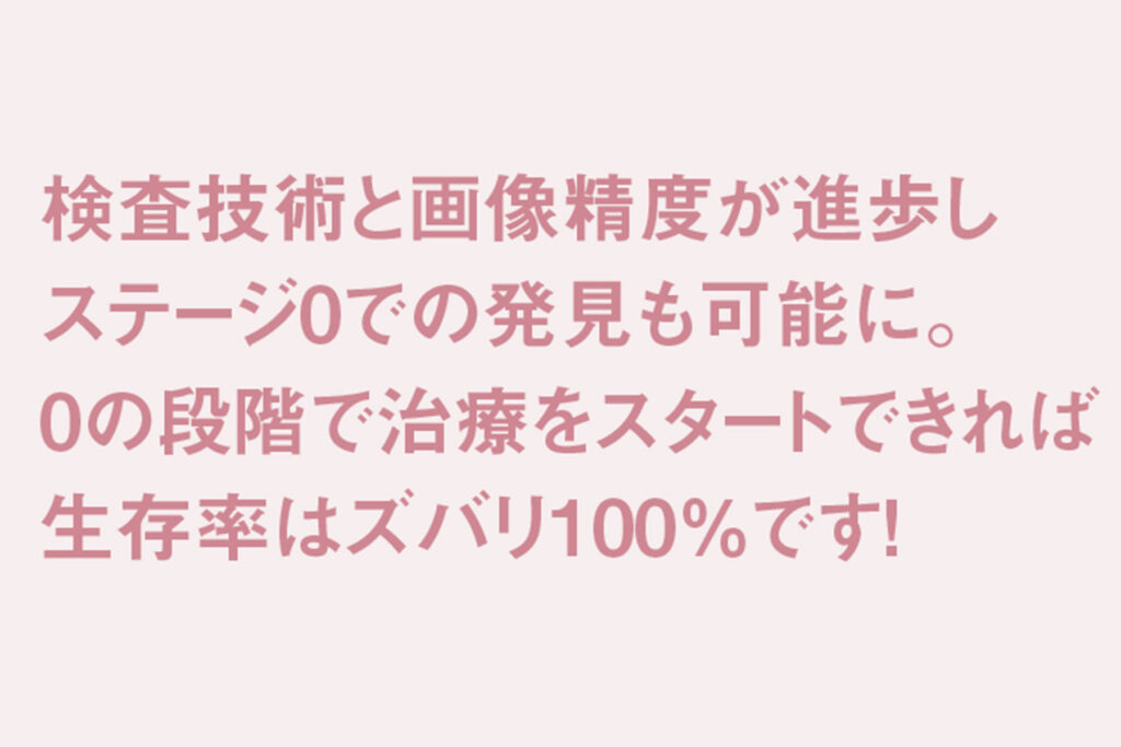 →検査技術と画像精度が進歩しステージ0での発見も可能に。0の段階で治療をスタートできれば生存率はズバリ100%です!