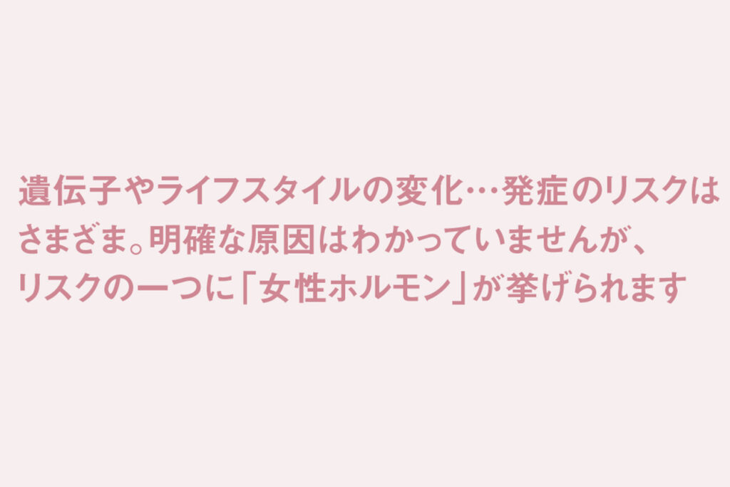 →遺伝子やライフスタイルの変化…発症のリスクはさまざま。明確な原因はわかっていませんが、リスクの一つに「女性ホルモン」が挙げられます