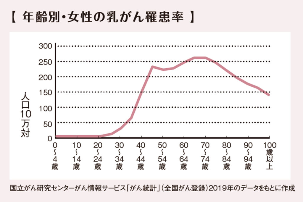 最も乳がんにかかりやすいのは50代中盤です。なので、CLASSY.読者の方の年齢層ではリスクが高いとは言えませんが、注意が必要な方もいらっしゃいます。