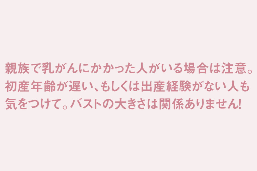→親族で乳がんにかかった人がいる場合は注意。初産年齢が遅い、もしくは出産経験がない人も気をつけて。バストの大きさは関係ありません!