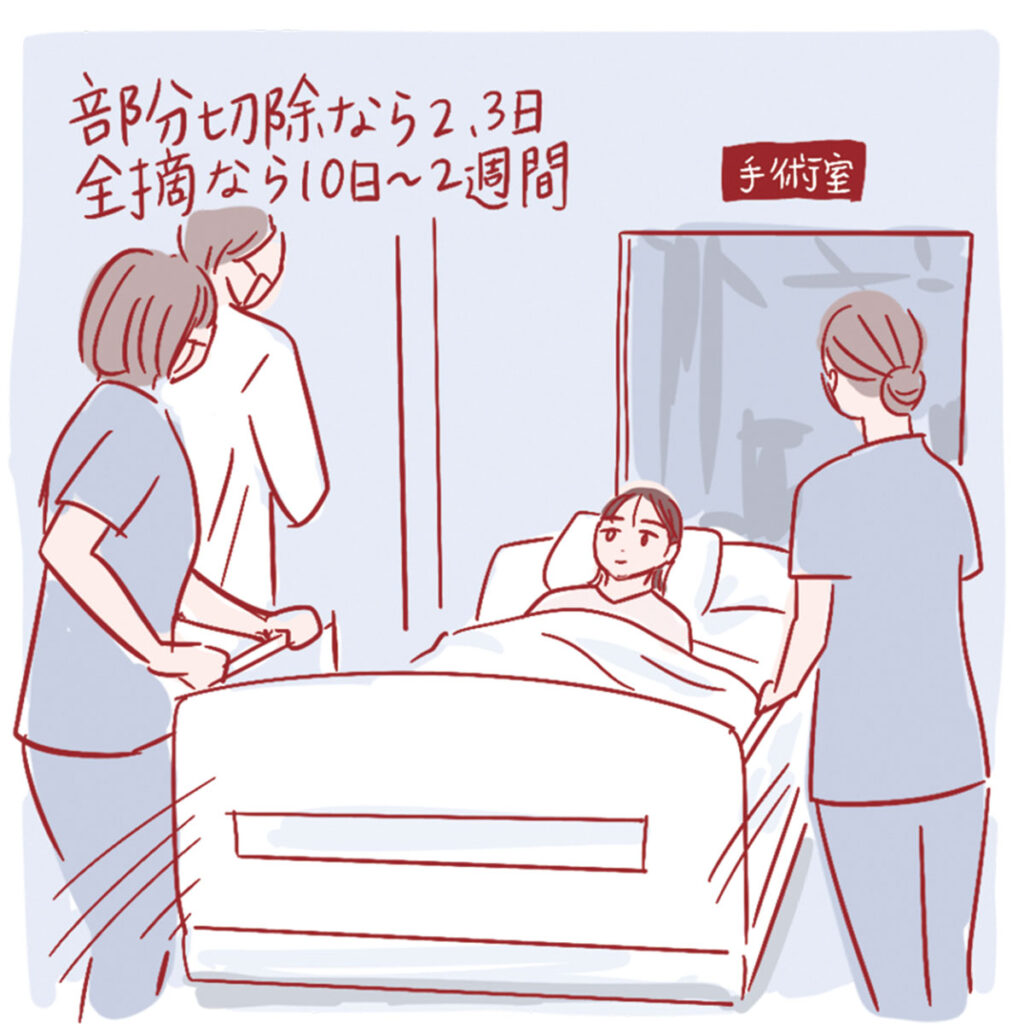 しこりの組織の一部を針生検で採取して、病理組織診断を行います(約¥15,000)。乳がんの診断がついたら、さらに詳しいがん性質の検査や(¥10,000~20,000)MRIやCTでの広がり診断(¥10,000~20,000)を行い、適切な手術や薬物を選ぶための検査をします。ここまでは全て外来受診のみでOK。仕事をするなど、普段の生活を送りながら手術に向けての準備をします。