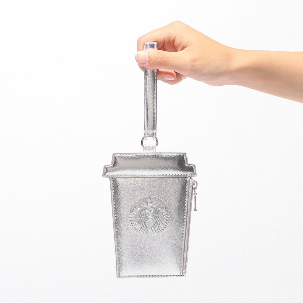 今年らしいメタリック生地のペーパーカップ型のコインカードホルダーです。薄型ですがコインポケットとカード3枚を収納可能なスリットが付いています。表面に立体感をつけてサイレンロゴを表現。ボタン付きストラップでホリデー2023ショッパーバッグメタリックシルバーと組み合わせて使うとぴったり。