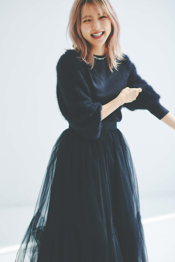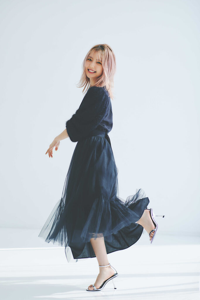 【衣装】ニット¥14,300(JUSGLITTY/ジャスグリッティー プレスルーム)チュールスカート¥18,700(EMMEL REFINES/エメル リファインズ オンラインストア)サンダル¥9,900(CHARLES & KEITH/CHARLES & KEITH JAPAN)ネックレス¥11,000(IRIS 47)ピアス¥29,700(les bon bon)リング¥19,800(PLUS VENDOME/プラス ヴァンドーム)