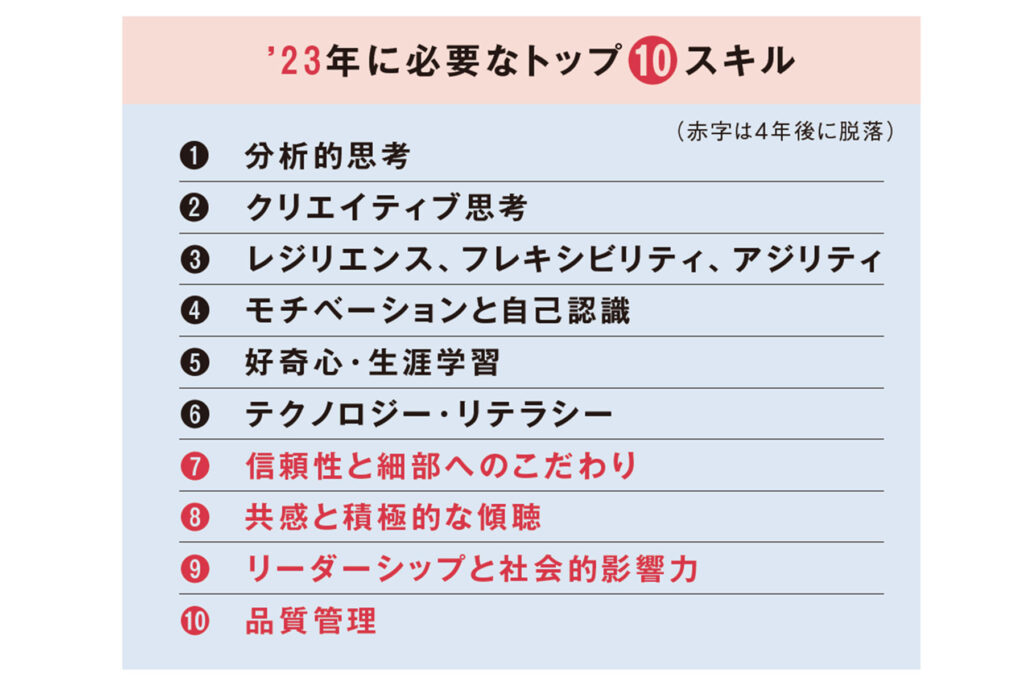 World Economic Forumの発表によると今後4年で特に重要なスキルは分析的思考とクリエイティブ思考。また、’23年に必要とされている上位10のスキルのうち、4つのスキルが4年後の’27年には消え、新たに4つのスキルが加わると予想され、変化のスピードはさらに加速しそうです。「スキルは形がなく、うまく言葉にできないものなので、自分のスキルを言葉で伝えられるようにしておくことが今後のキャリア形成においても大切です」(栗原さん)
