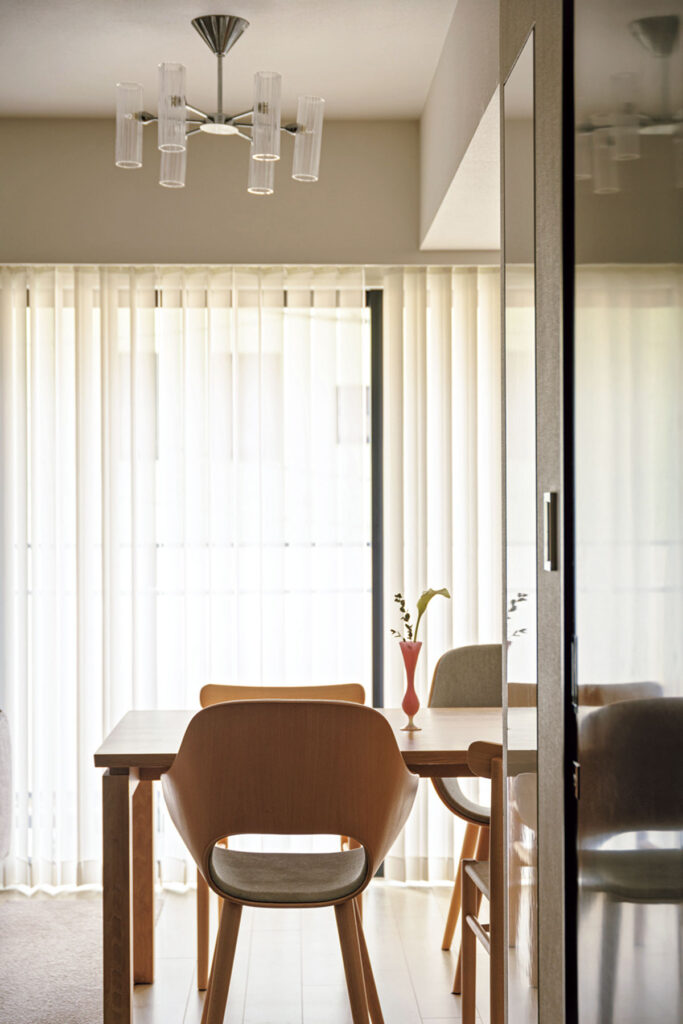 食事はもちろん、リモートワークもダイニングスペースで。テーブルと椅子はともに「マルニ木工」で揃えたもの。ゆったり体を包むアームチェアにミニマルなデザインの椅子を組合せて、空間にゆとりを持たせている。